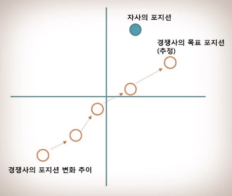 예를 들어, 지속적인 포지셔닝 맵의 모니터링을 통한다면, 경쟁사의 목표 포지션이 어디인지, 전략이 무엇인지 동향이 어떻게 되는지 추정할 수 있을뿐더러, 향후에는 직접적인 경쟁관계로 발전할 수 있기 때문에 수시로 포지션맵을 수정해가면서 경쟁사를 파악하는 것이 중요합니다.
