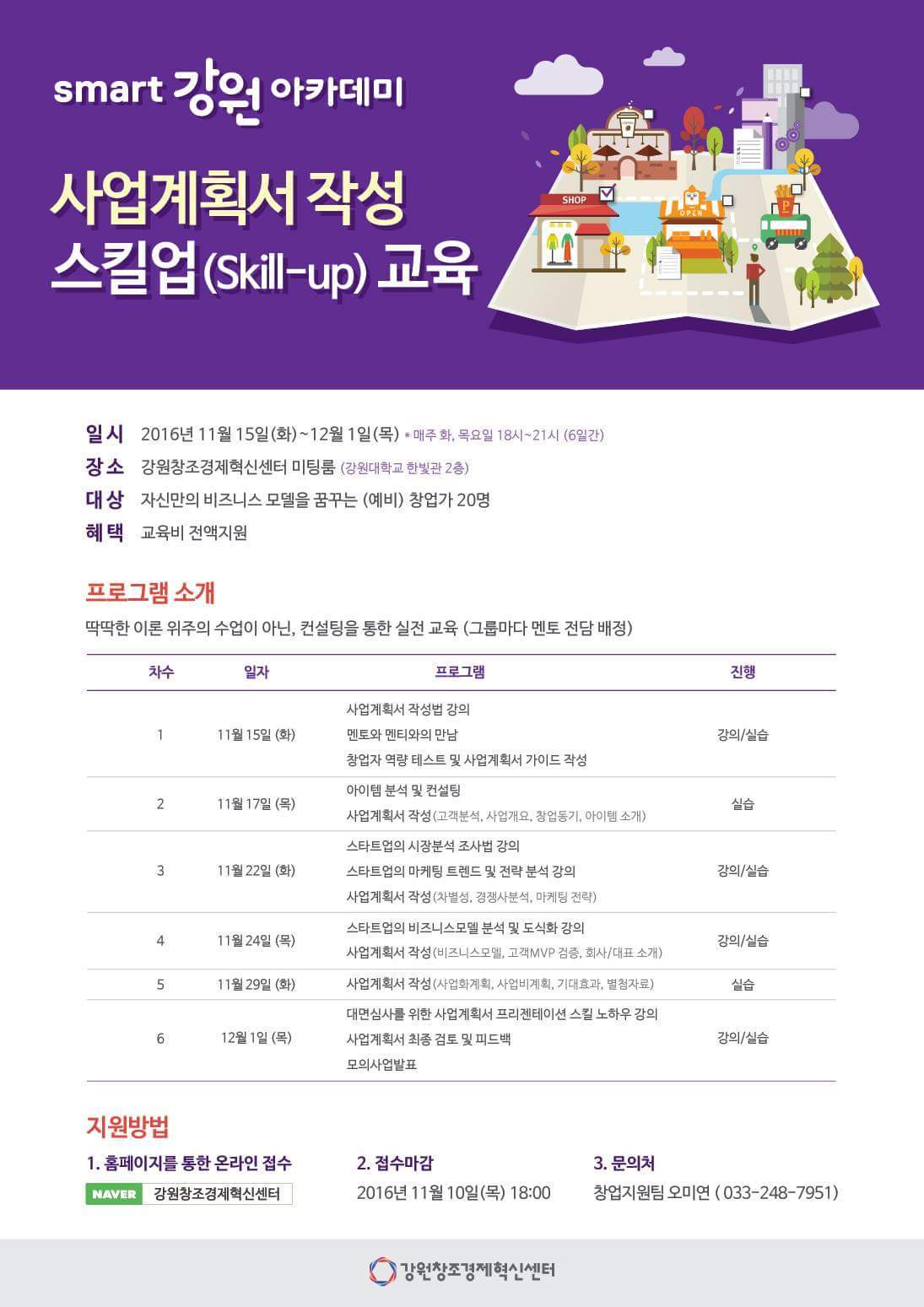 필자가 운영하는 (주)삼훈비즈랩에서는 강원창조경제혁신센터에서 주관하는 위 교육 프로그램을 운영하게 되었는데, 아직 신청을 받고 있다고 합니다. 지난 수요일 13명 신청되었다고 관계자분으로부터 이야기를 들었는데, 이제 몇 자리 남지 않았을 거예요. 부지런히 신청하세요~