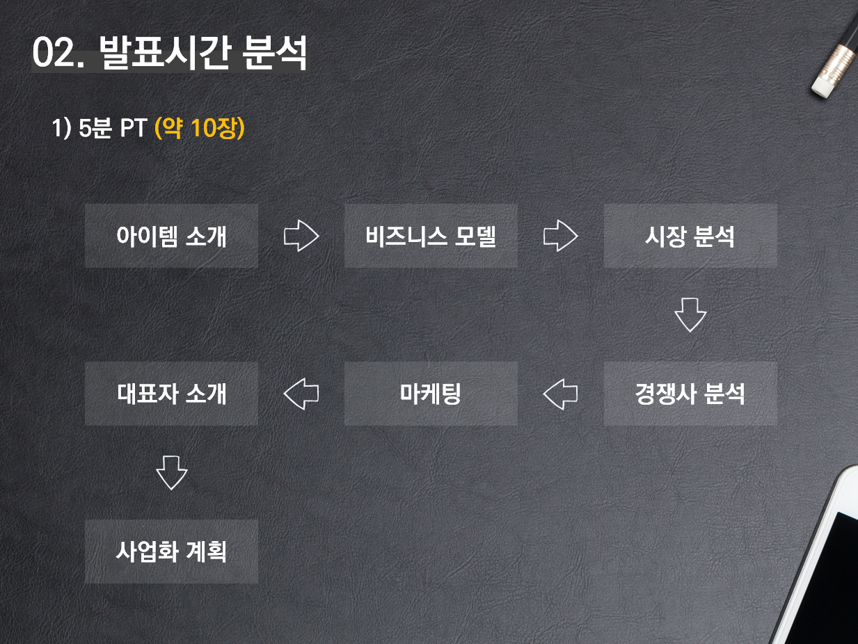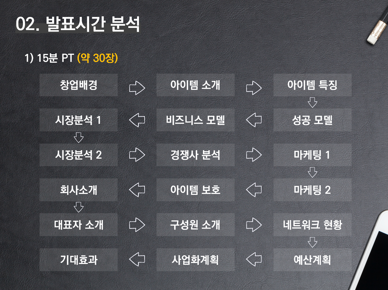 2012 ~ 2013년도에는 대부분 정부지원사업에서 대면평가를 진행할 때 5분이었지만, 요즘은 15분 정도 주는 것 같다. 15분은 생각보다 길다. 하지만 길다고 생각하고 구구절절 이야기를 풀다 보면 15분은 결코 길지 않다. 위의 목차 구성을 보면, 성공모델, 시장분석, 마케팅 분야 쪽이 5분 발표에서보다 강조되었다.