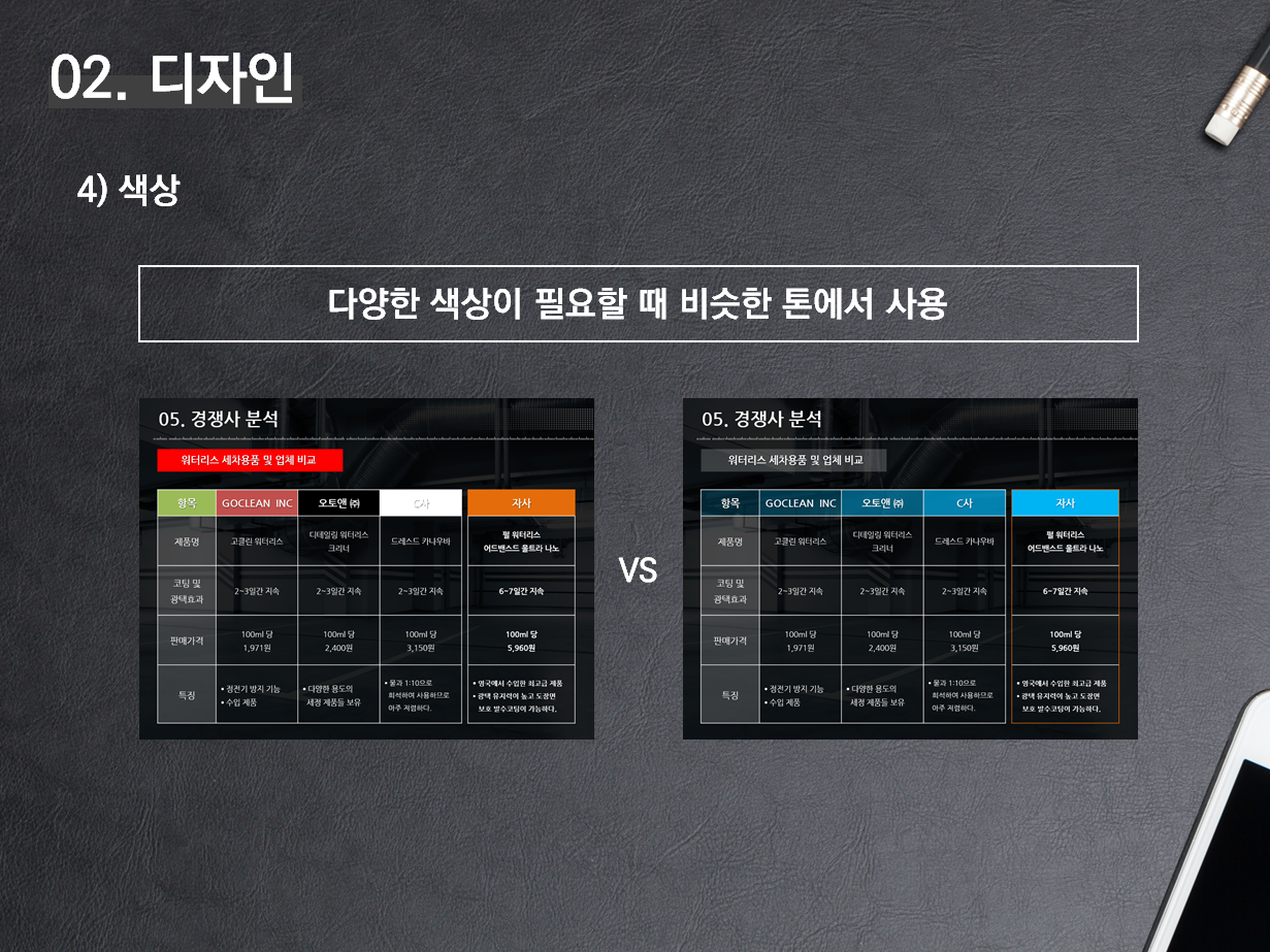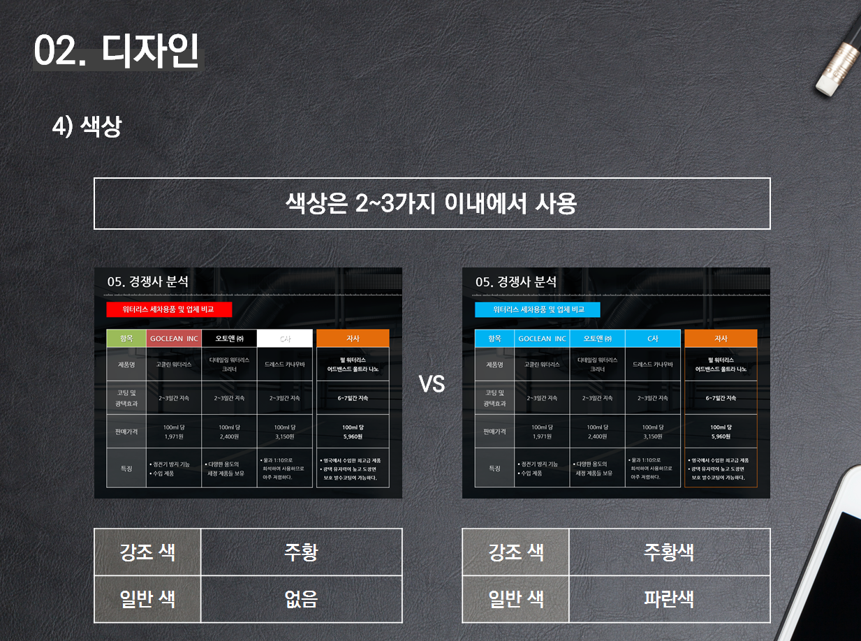 경쟁사 분석을 PT로 만들었을 때, 왼쪽과 오른쪽 중에... 어떤 게 눈에 들어오는가? 왼쪽과 같이 PT를 제작했을 때에는 모두 색상이 다르기 때문에 어떤 부분을 강조하고 있는지 알 길이 없다. 하지만 오른쪽에서는 비슷한 톤에서 PT를 만들었기 때문에 왼쪽보다는 쉽게 "자사"를 찾을 수 있다.
