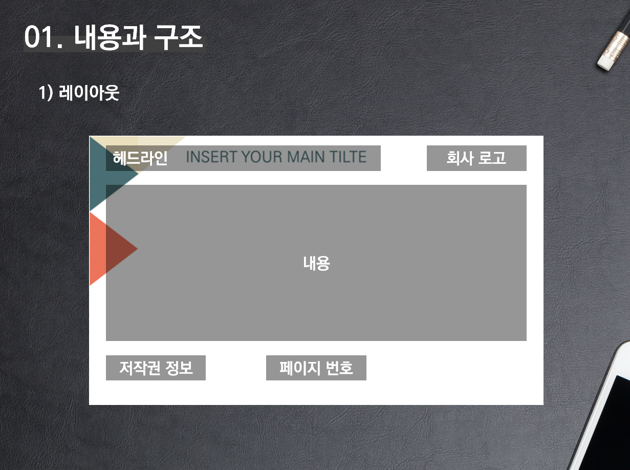 필자는 대부분의 사업계획서를 제작할 때 위와 같은 구조로 제작한다. 때에 따라 다른 형태로 제작하기도 하지만, 심사위원들에게 익숙한 구조가 가장 좋다고 (개인적으로) 생각한다. 구조가 바뀔 때, 심사위원의 뇌는 이미 피로해져 버리기 때문이다. 생각해보자. 헤드라인이 우측 하단에 있고, 좌측 상단에 저작원 정보가 있다면 어떻겠는가?
