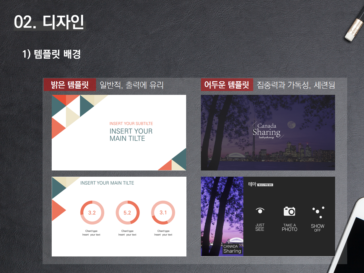 프레젠테이션을 할 때에는 디자인이 정말 중요하다. 물론 내용도 중요하겠지만, 시각적으로 바로 보이기 때문에 생각보다 많은 신경을 써야 한다. 한글 버전으로 열심히 사업계획서를 작성했다면, 이제는 PPT를 활용하여 발표용 사업계획서를 제작해야 하는데, 보통은 흰 배경에 작성하기 마련이다.