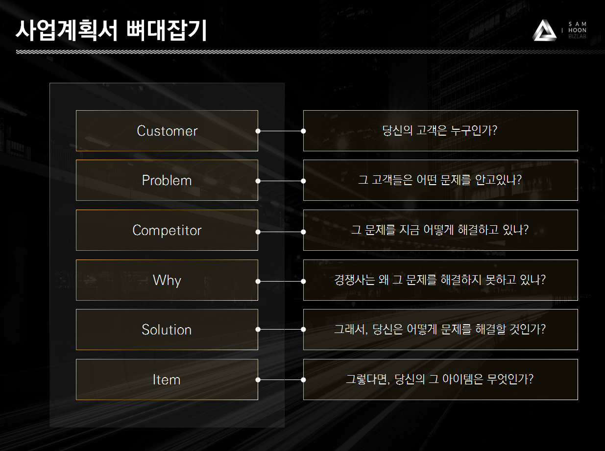 그렇다한들, 건축을 할 때에도 뼈대를 잡지 않는가? 이것만큼은 필연적인 사실이 아니던가. 그렇다면 사업계획서에도 뼈대라는 것이 존재하지 않을까? 아무리 좋은 아이템이라고 한들, 그냥 이것저것 사업계획서에 쑤셔 넣는다면 분명 보기 싫고 매력 없는 사업계획서가 나올 것이 뻔하다.