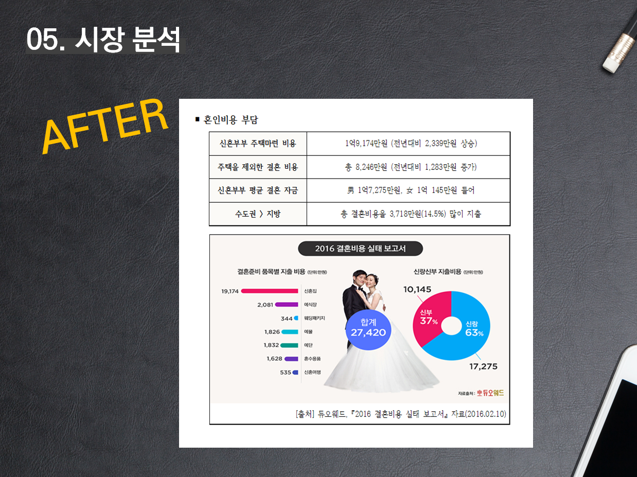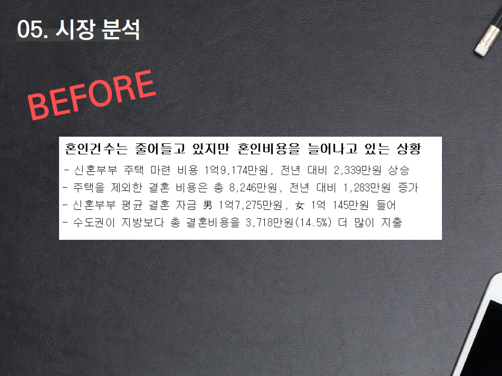 위 내용은 혼인건수는 줄어들고 있지만 혼인비용은 늘어나고 있는 상황을 작성한 것인데... 필자는 처음 이 자료를 보자마자 직업병이... OTL.... 다 뜯어고치고 싶었다. 완벽하지는 않겠지만, 적어도 짧은 시간 심사해야 하는 심사위원들에게 어필할 수 있도록 다시 표현할 필요가 있어 보였다.