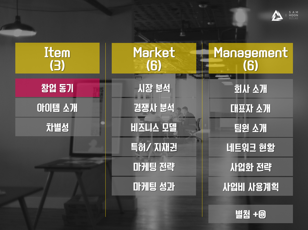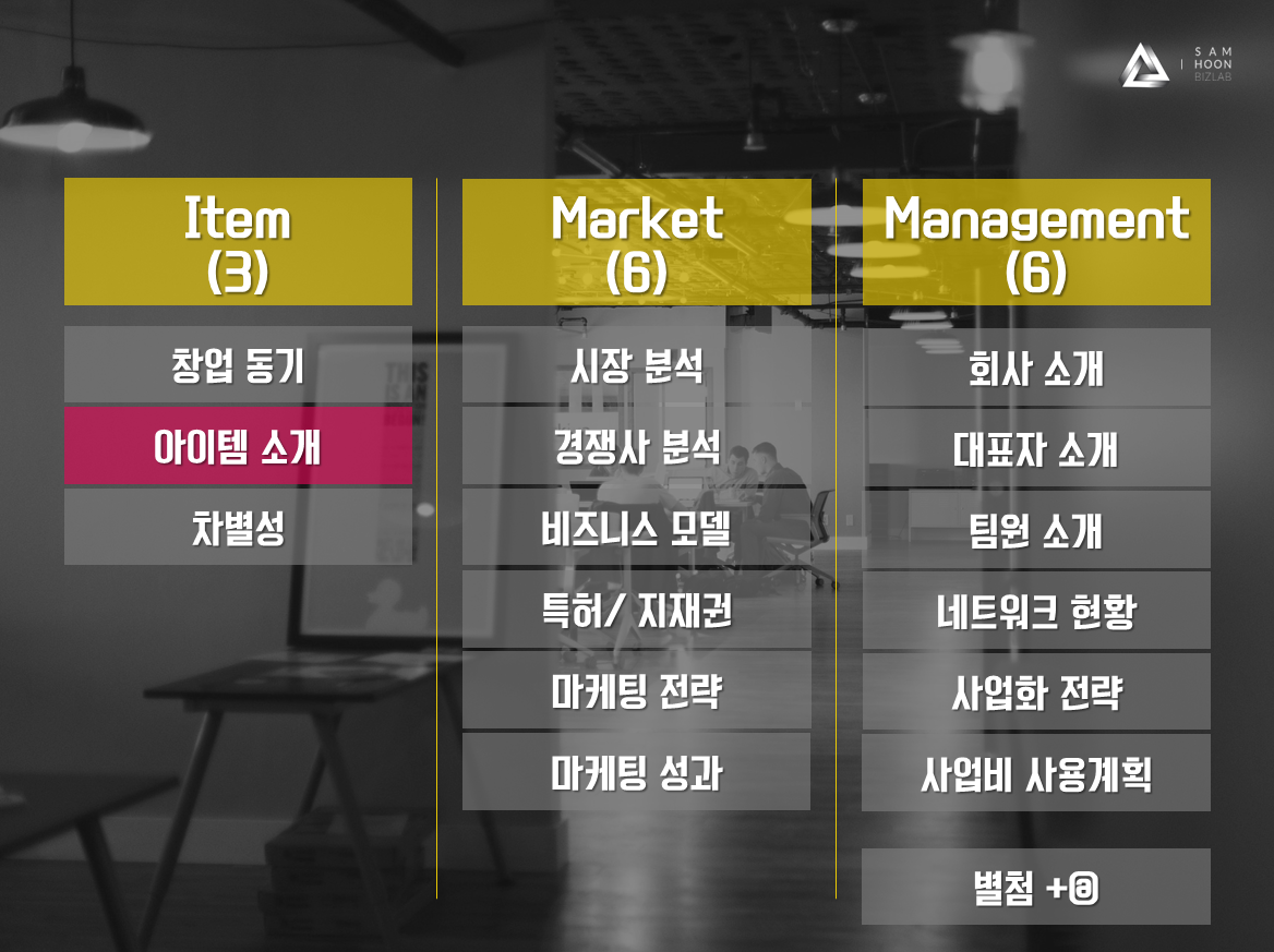 사업계획서는 3가지 파트로 구분해서 작성할 수 있는데요. 특히, 정부지원사업에서 원하는 목차는 위와 같습니다. 물론 사업계획서에는 더 많은 목차가 있는데, 이제 막 시작한 스타트업에게 무리하게 자료를 요구하지는 않습니다. 고로! 누구든지 쉽고 재미있게 사업계획서를 작성할 수 있다는 것입니다.