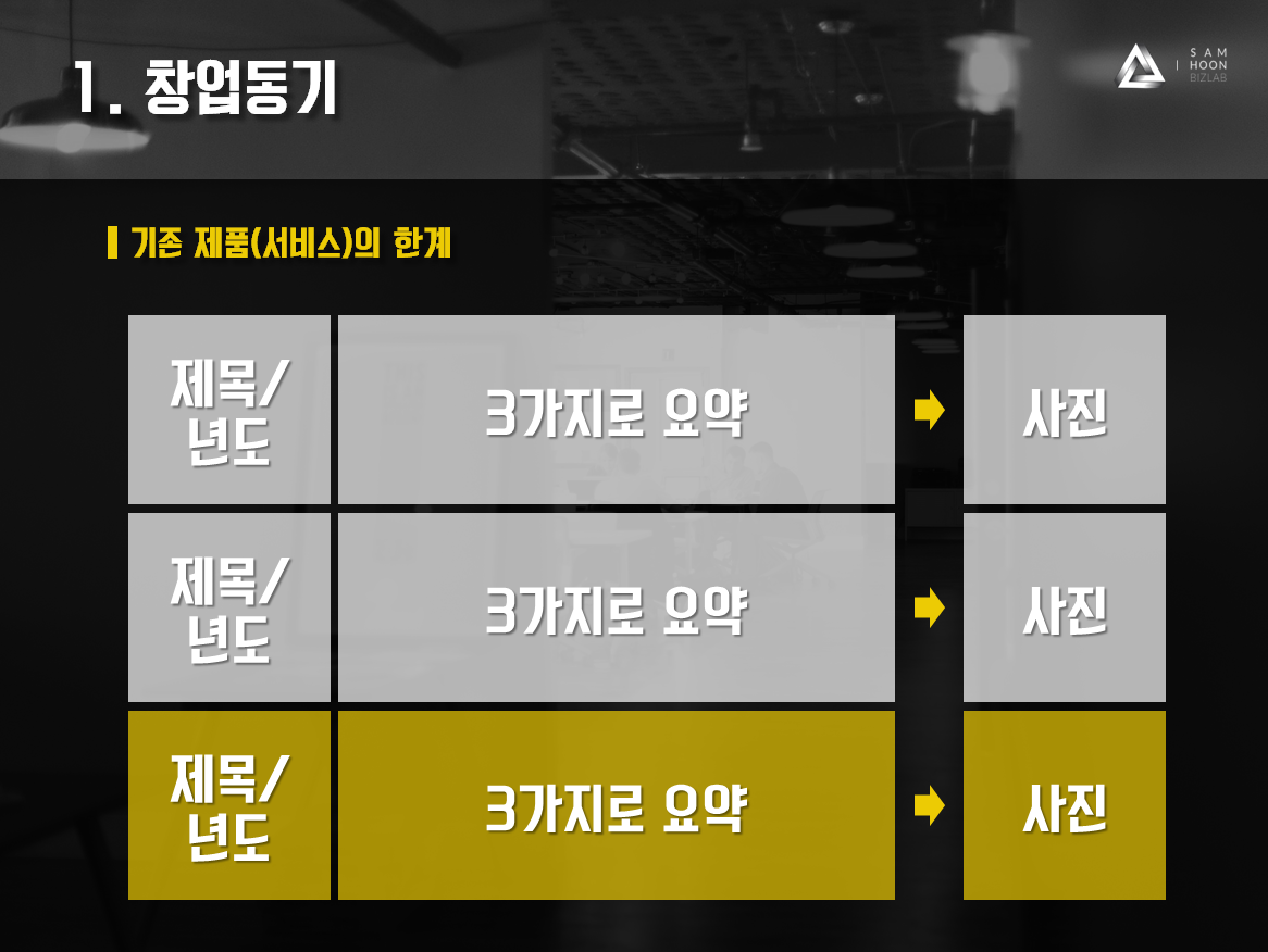 만약 내가 만들고자 하는 제품(서비스)이 기존 제품을 보완하는 형태라면, 아래와 같은 폼을 사용해주세요. 예를 들어, 낡은, 오래된, 구식의 기술로 아직도 고객이 사용하고 있다면, 언제 어떤 아이템인지 표현해주세요! 그리고 마지막에는 내 아이템에 대한 서비스 내용을 채우시면서, 기존 제품(서비스)의 한계성을 보완한 제품이라고 핵심 포인트를 주시면 상대방은 왜 당신이 창업했는지, 왜 이 아이템을 개발했는지를 알아챌 거예요.