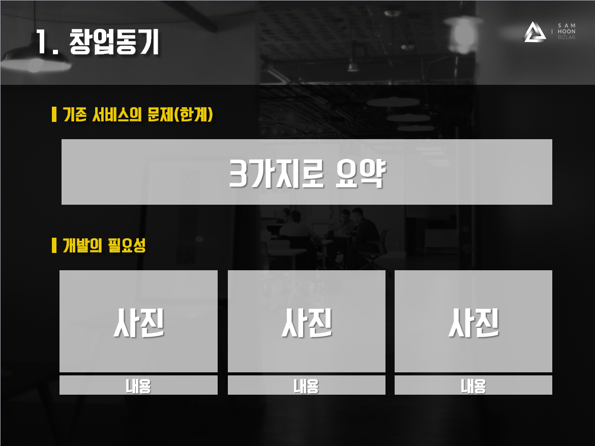 아래 폼은 기존 서비스의 문제를 3가지로 요약하고, 필요성 여부를 다양한 이미지로 어필할 때 사용하세요. 때에 따라 이미지가 강조될 때가 있습니다. 개발이 왜 필요한지 명확하게 전달할 때에는 사진 + 객관적인 데이터로 사업계획서를 만들어주세요.
