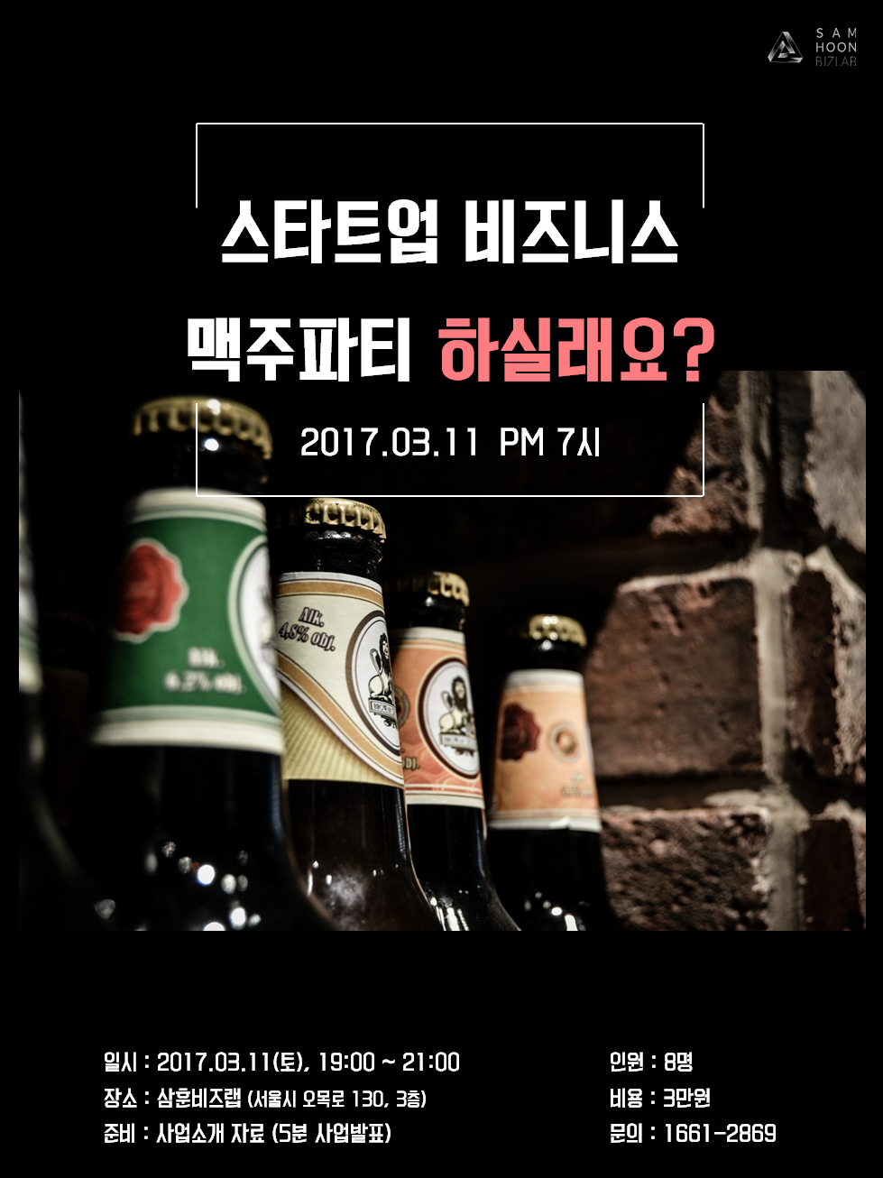 스타트업 대표님들에게도 봄이 찾아왔으면 좋겠어요! 그래서 준비했어요. 다양한 분야의 사람들과 만나 맥주 한 잔 하시면서 비즈니스도 서로 이야기하고, 새로운 인연, 인맥 만드셨으면 좋겠어요. 파티참가비용은 1원도 남김없이 최고퀄리티 안주와 술값으로 사용됩니다.