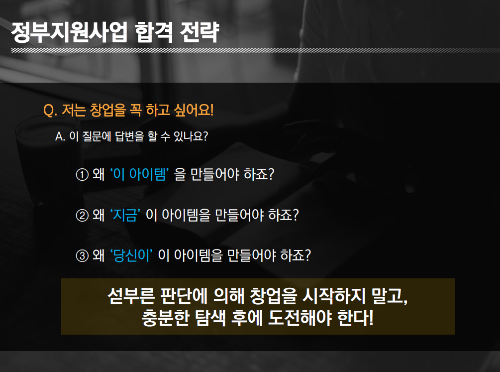 정부지원사업 합격전략이라고는 했지만, 실제 위 3가지 질문은 창업을 시작하는데, 본인 스스로 답변하고 가야 할 질문들이다.