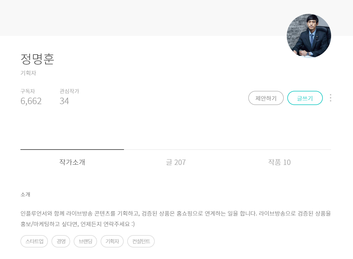 2020년 1월 25일, 기준으로 브런치 채널의 구독자는 6,662명이다. 글은 207개를 작성했고, 매거진은 10개 모두 업로드 중이다. 대표 키워드 및 짧은 소개글 역시 수정해야 할 부분!