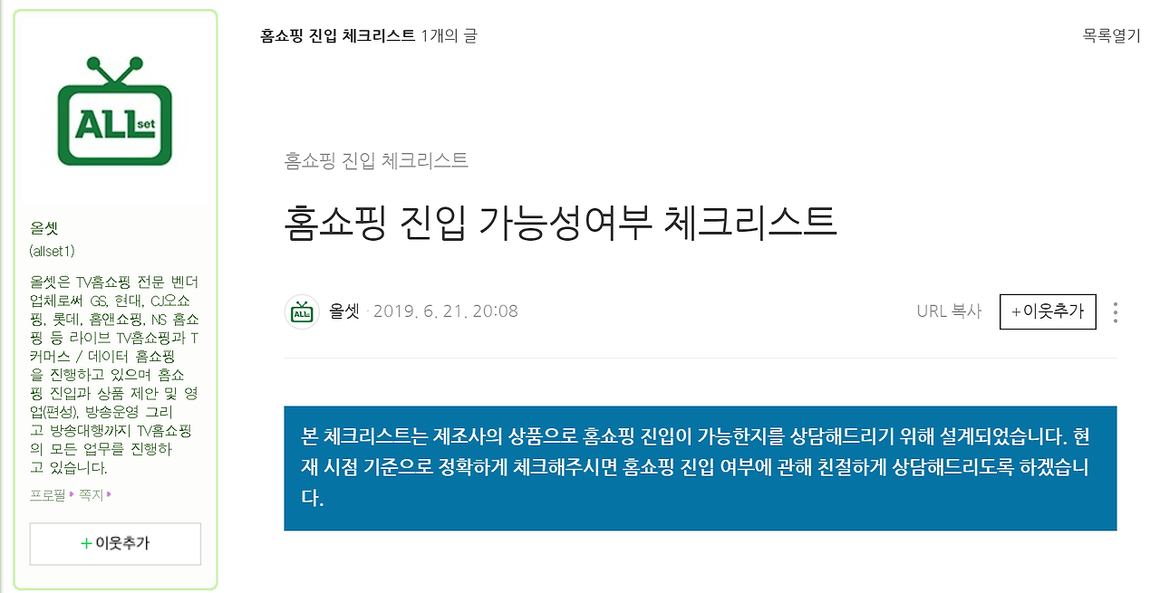 ※ 혹시 홈쇼핑 진입을 원하시거나 궁금하신 분들은 아래 체크리스트를 작성해주세요.