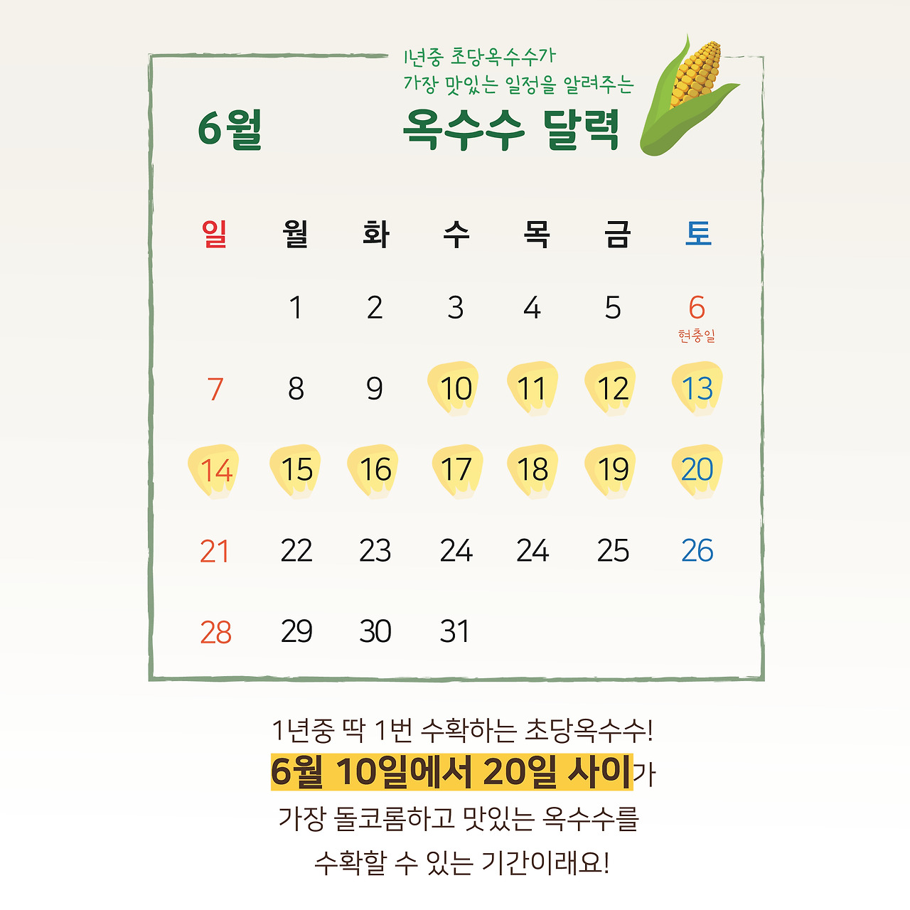 6월 10일에서 20일 사이가 가장 돌코롬하고 맛있다고 합니다. 여러분들께는 황금 타임에 수확한 초당옥수수 꼭 맛보실 수 있도록 농가와 협의하였습니다.