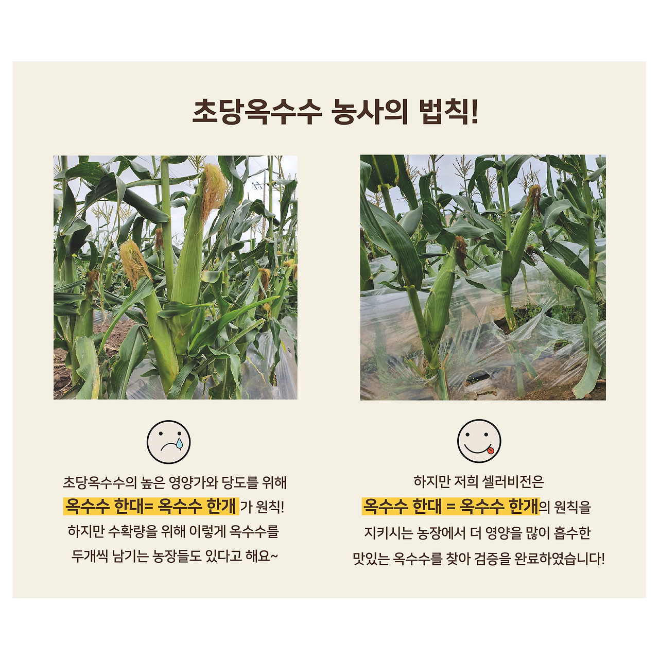 저희 셀러비전은 옥수수 한대 = 옥수수 한 개의 원칙을 지키시는 농장에서 더 영양을 많이 흡수한 맛있는 옥수수를 찾아 검증을 완료하였습니다.
