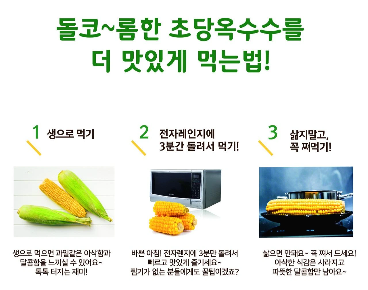 계속 말씀드리지만~~~ 초당옥수수는 생으로 먹어야 기가 막힌 맛을 느껴보실 수 있고요. 전자레인지에 돌릴 때는 그릇에 물 살짝 (소주컵 1잔 정도) 넣어주고, 돌려주세요.