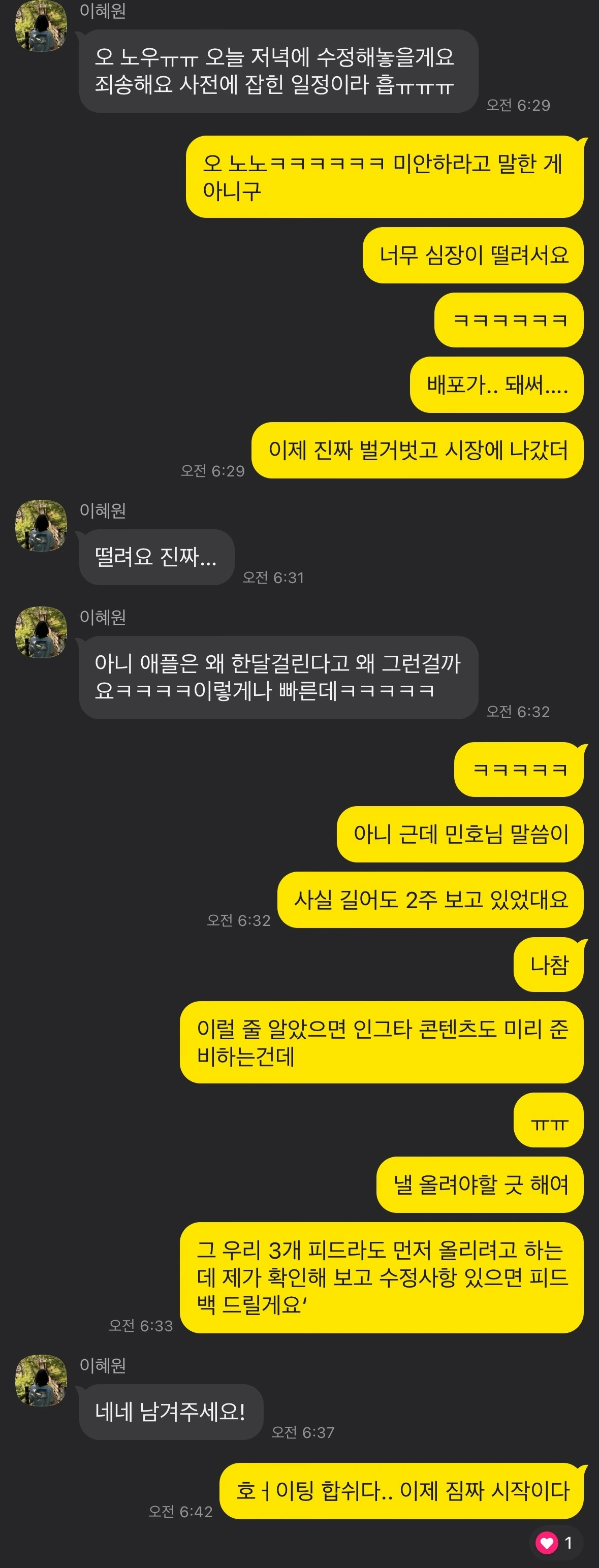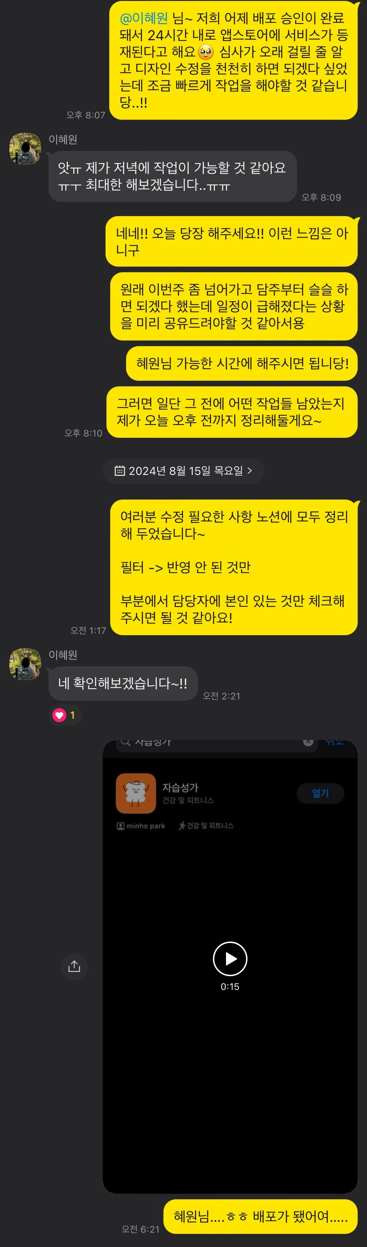 그렇게 많은 시간이 흘러 한 번도 생각해 보지 않았던 앱을 통해서 우리의 서비스를 만들게 되었다. 그것도 광복절 날. 의도하지 않았지만 공교롭게도 서비스가 앱스토어에 등록된 날이 8/15 광복절이라니.. 어쩐지 그동안 자체 채널 없이 타 서비스에 의존하며 사업을 이어나갔던 우리에게서 해방되는 느낌이 들었다. 이제 진짜 차근차근 우리만의 서비스를 키워나갈 수 있다는 생각에 들뜨는 기분을 숨길 수 없었다.