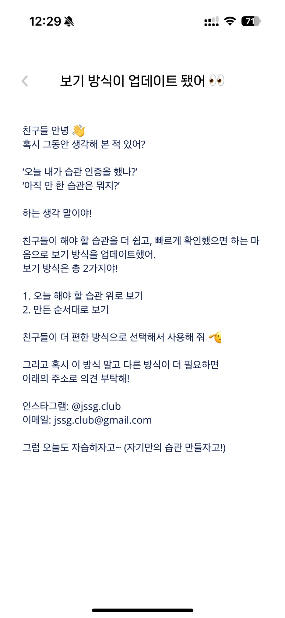 배포를 완료하니 고맙게도 많은 친구들이 호응을 해줬어. 내가 필요한지도 몰랐는데, 막상 있으니 너무 편하다는 이야기를 해준 친구도 있었는데 너무 힘이 되더라! 우리는 앞으로도 친구들의 활동을 열심히 관심 가지고, 함께 하면서 불편한 구석을 쏙쏙 긁어 주는 서비스가 되고 싶어. 좋아해 줘서 너무 고마워! 다음 업데이트는 (아마도) 습관 수정하기에 대한 이야기로 돌아올 것 같아. 그전에 기능 업데이트를 위해 우리 팀이 하고 있는 활동에 대한 이야기로 먼저 돌아올게! 그럼 또 만나자 :)