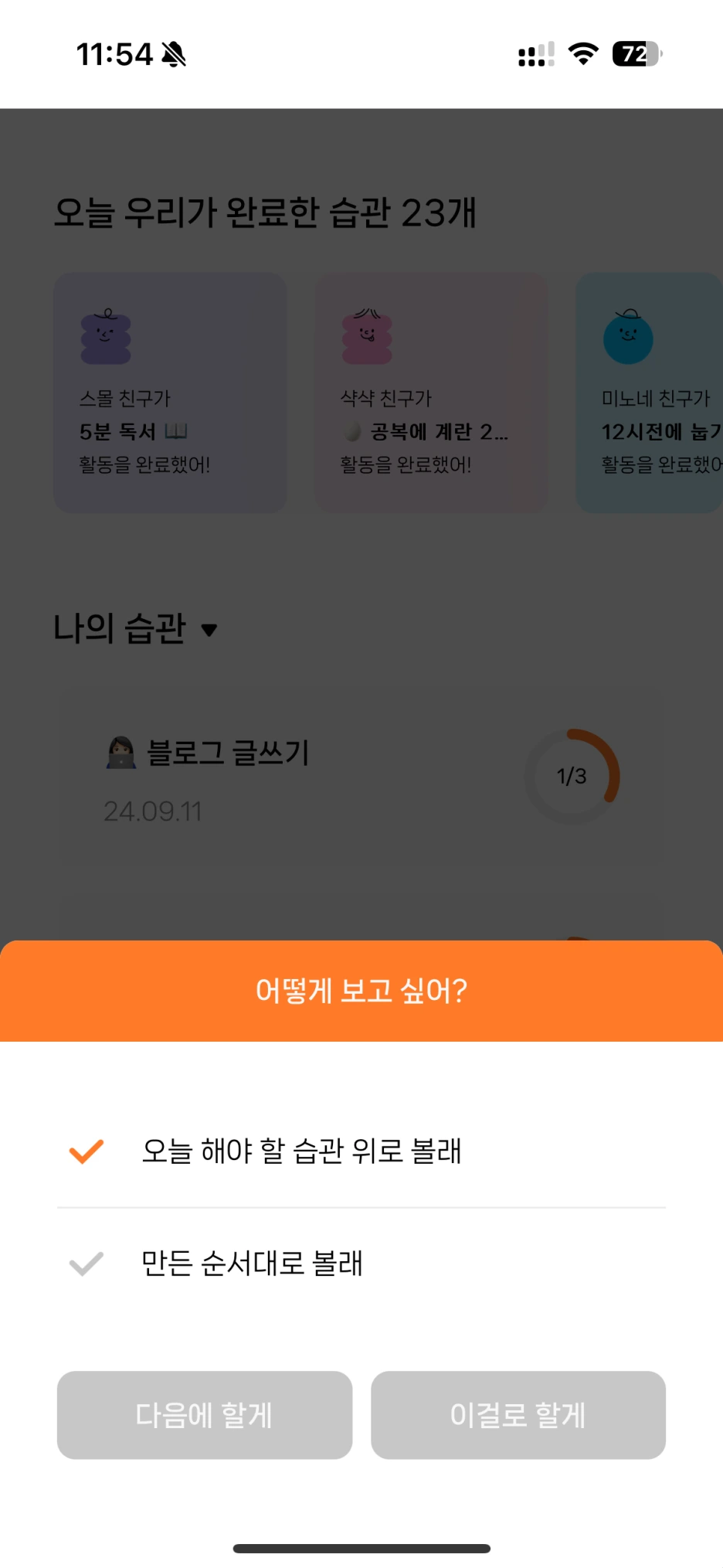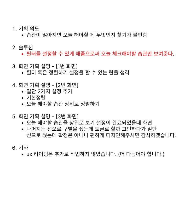 이번에 업데이트 한 내용은 <정렬> 기능이었어. 인증해야 하는 습관이 많아지다 보니깐 '이걸 내가 오늘 하는 날인가..? 오늘 인증을 눌렀나?' 헷갈리기 시작하더라고. 그래서 오늘 해야 할 습관을 상단에 띄워주기 정렬을 만들었어. 사실 처음엔 필터를 통해서 해야 할 습관과 아닌 습관을 구분하는 것도 생각을 했는데, 그럴 경우 해야 할 습관이 없는 친구들은 공백이 발생하게 돼서 일단은 필터보다는 정렬이 좋겠다는 생각이 들더라고.