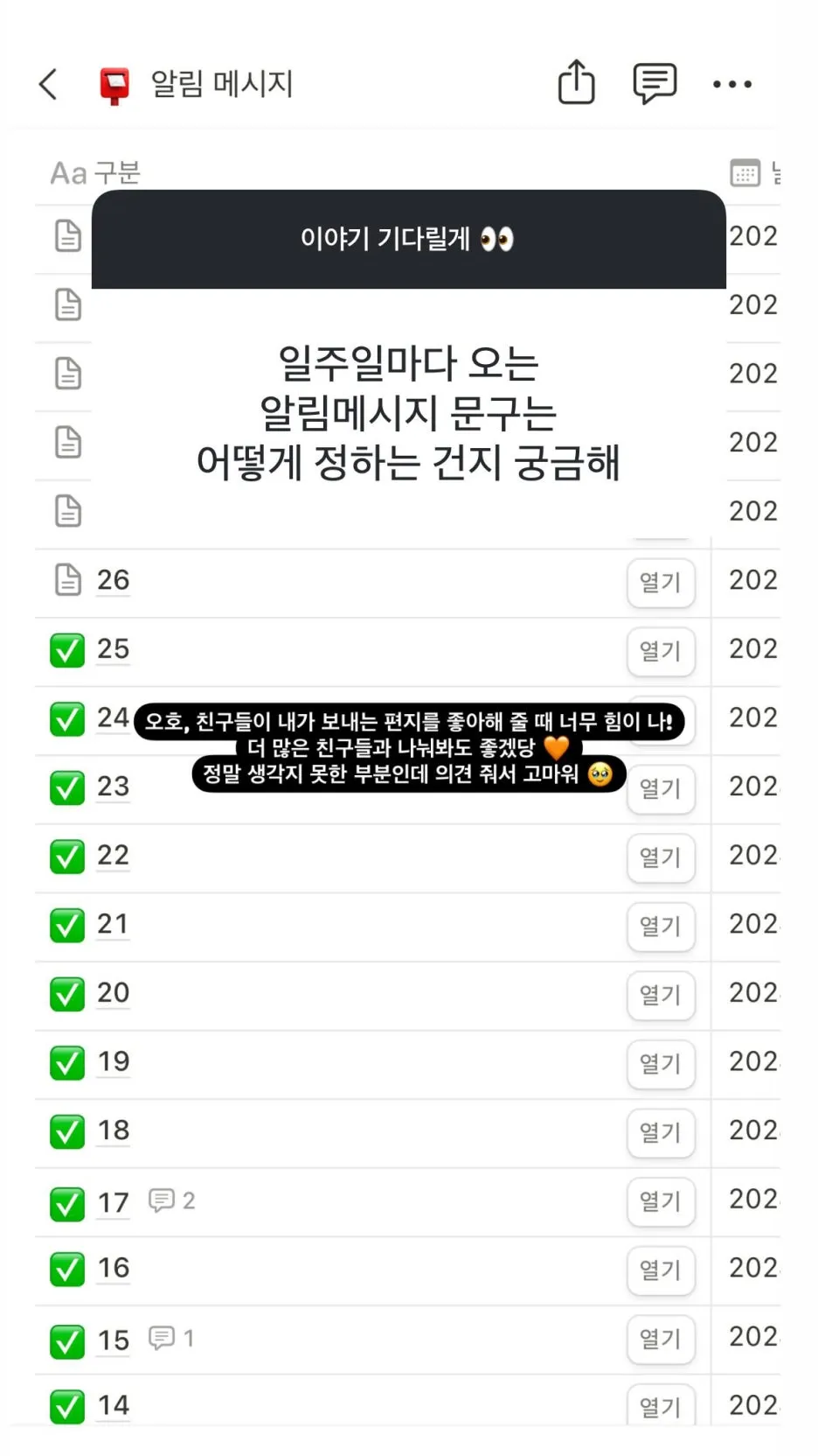알림 메시지(문장 공유): 많은 친구들이 사랑해 주고 있는, 자습성가의 응원 메시지
