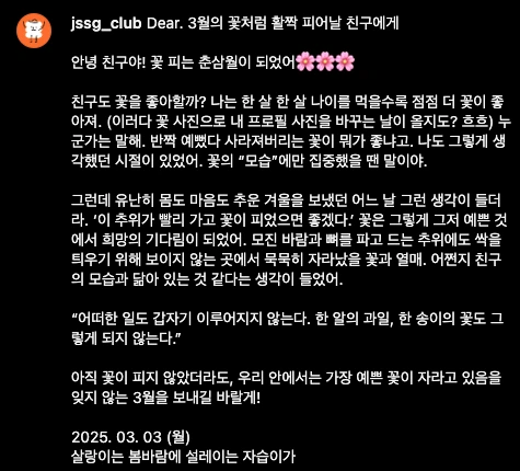 2월부터 알림 메시지를 편지의 형식으로 SNS에도 공유하고 있어. 알림 메시지를 어떻게 쓰게 됐는지 비하인드가 궁금하다는 친구의 의견 덕분에 만들게 된 콘텐츠야. 생각해 보니 단순히 몇 문장에 담지 못한 하고 싶은 말들이 있었는데 너무 좋은 아이디어였지. 이번 주에는 3월을 맞이해서 봄에 대한 이야기를 썼는데, 쓰고 보니깐 우리에게 꼭 해주고 싶은 이야기이기도 해서 친구들에게도 공유해 보려고 해.