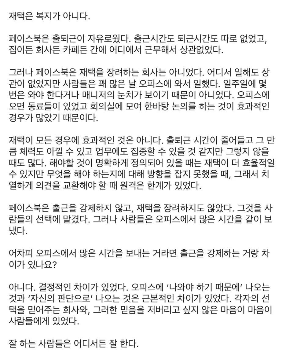 "재택이 모든 경우에 효과적인 것은 아니다. 출퇴근 시간이 줄어들고 그만큼 체력도 아낄 수 있고 업무에도 집중할 수 있을 것 같지만 그렇지 않을 때도 많다. 해야 할 것이 명확하게 정의되어 있을 때는 재택이 더 효율적일 수 있지만 무엇을 해야 하는지에 대한 방향을 잡지 못했을 때, 그래서 더 치열하게 의견을 교환해야 할 때 원격은 한계가 있었다."