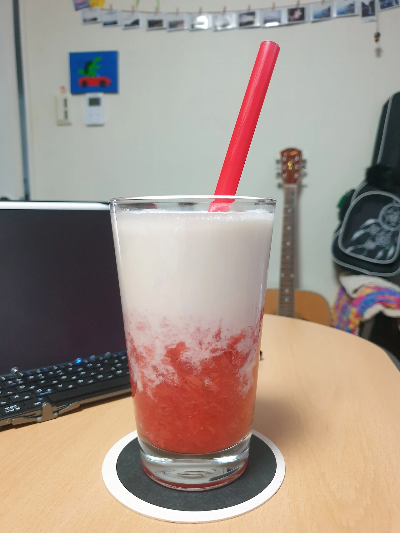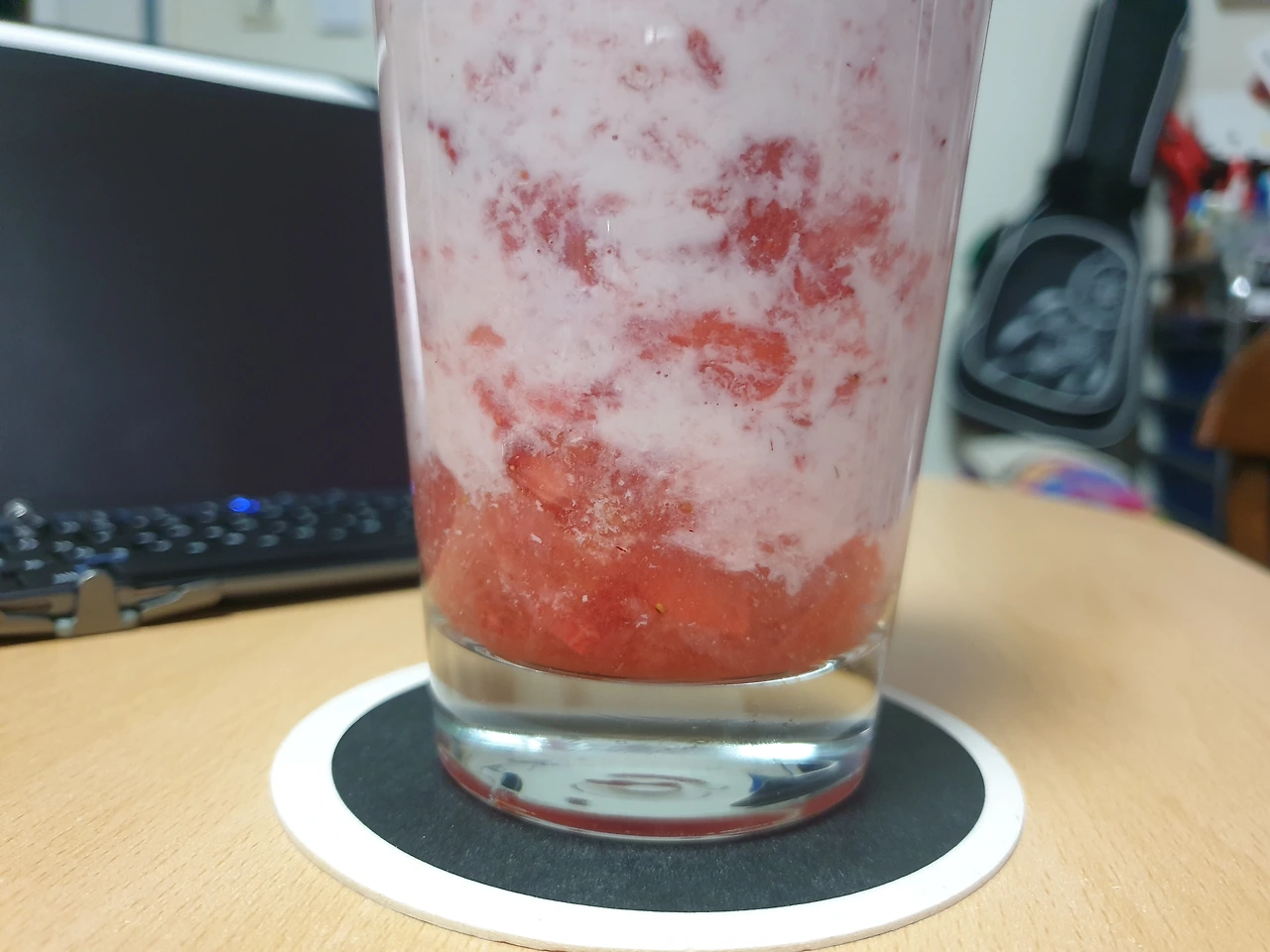 유리잔(용기가 투명해야 분리된 빨갛고 하얀 층이 예쁘다)에 딸기 퓨레를 넣고, 잔을 비스듬히 뉘어서 유리잔벽을 타고 조심스럽게 우유를 넣는다.