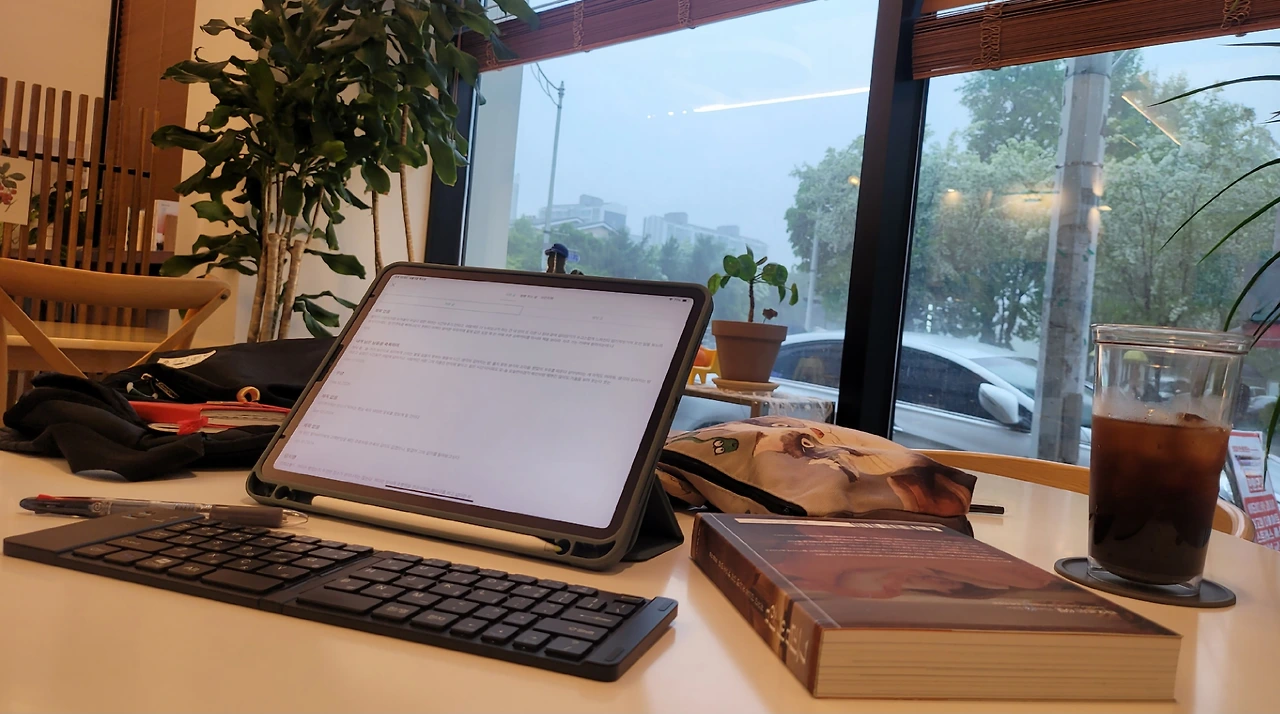 가방에 챙겨 온 것들을 테이블 가득 늘어놓고