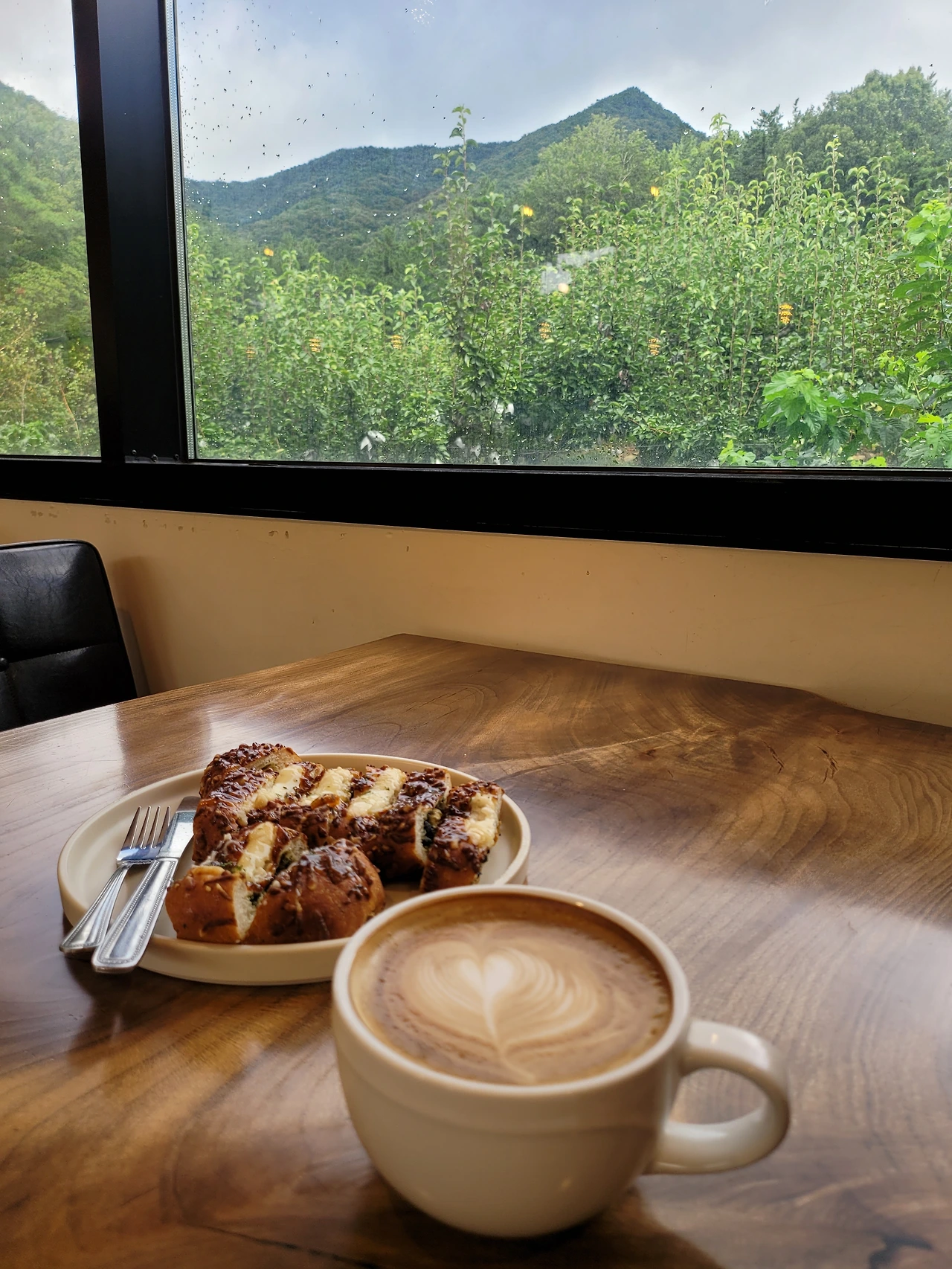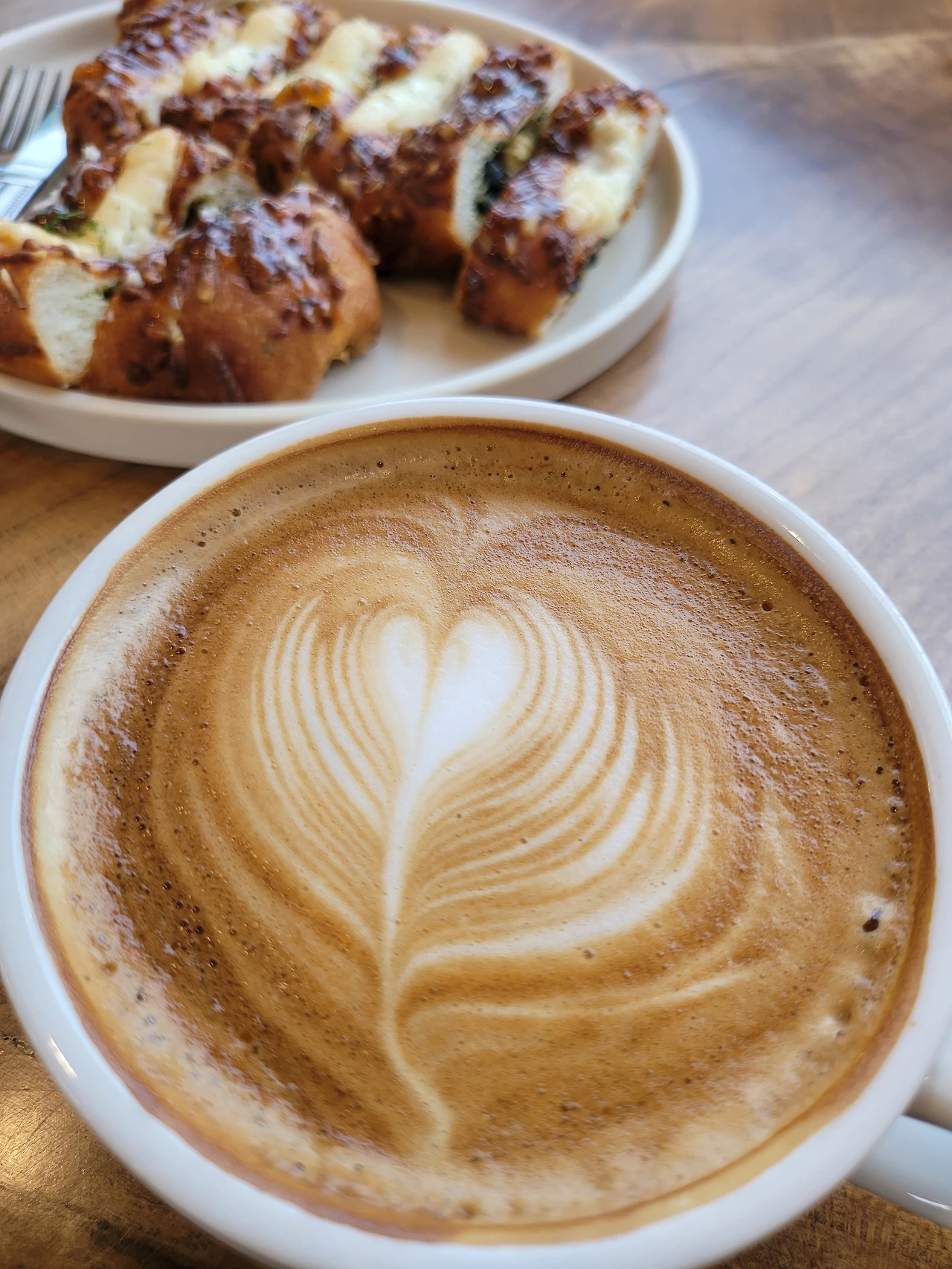 카페라테를 주문하며, 한참을 바라보다 결국 본능에 무릎 꿇듯 커다란 빵 하나를 들고 말았다.