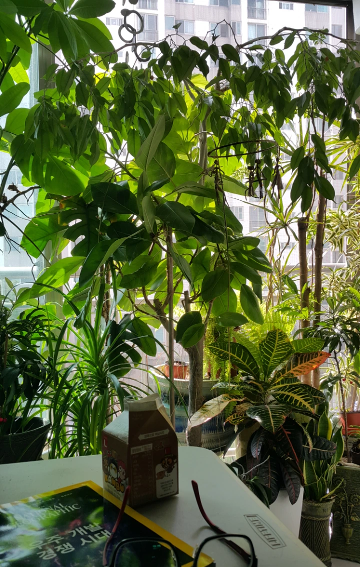 누런 잎은 따주고, 영양분을 빨아먹던 괭이밥은 뿌리까지 뽑아내지 않으면 금세 잎을 틔워낸다. 커피 찌꺼기나, 직접 배합한 부엽토로 영양을 보충해주고, 집이 작아진 녀석들은 이사를 시켜준다. 작은 녀석들이야 일도 없지만, 키가 천장에 닿는 울창한 녀석들은 혼자 하기엔 극한의 노동력이 필요하다.