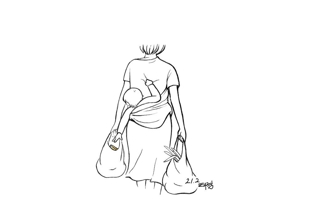 등에 업힌 아이는 마파람에 게 눈 감추듯 야금야금 먹어버리고는, 새롭게 눈 뜬 맛의 식탐으로 장바구니 속 빵 봉지를 향해 꼬꾸라지며 포대기에서 매당구를 탄다. 포대기가 다 풀어지도록 대롱거리다 보면 집에 도착하기도 전에 빈 봉지가 되었더란다.