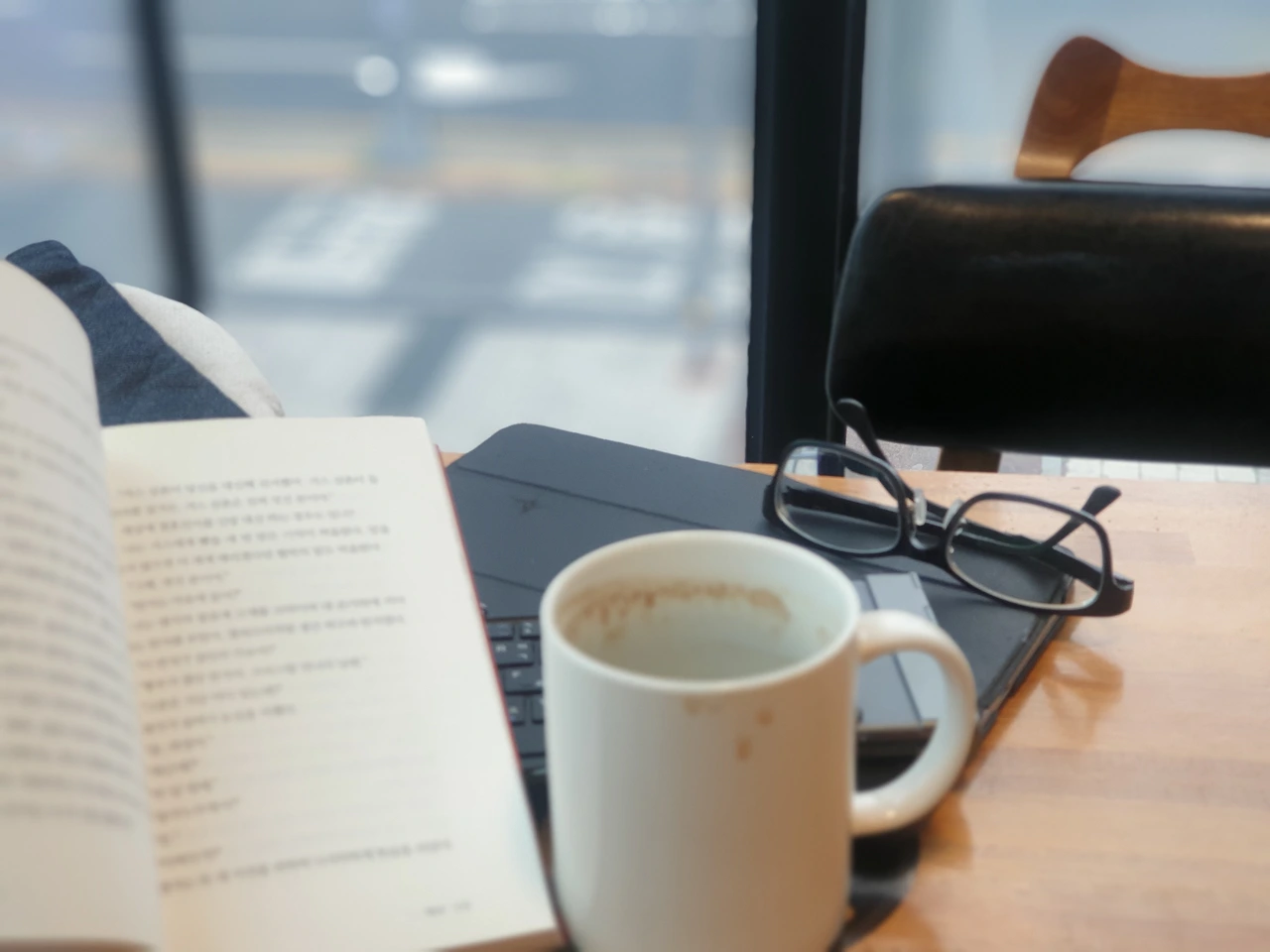 거리가 내려다보이는 카페 창가에 자리를 잡고 커피를 마신다. 테이블 위에는 읽을 책이 있고, 커피가 있으니 행복하다.