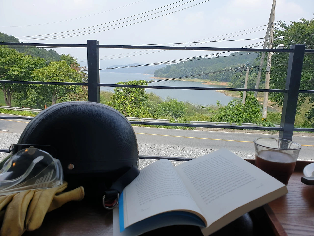 시원한 커피, 책, 음악, 멋진 풍경까지, 길가에 잠시 버려진 오토바이만 아니라면 완벽하다.