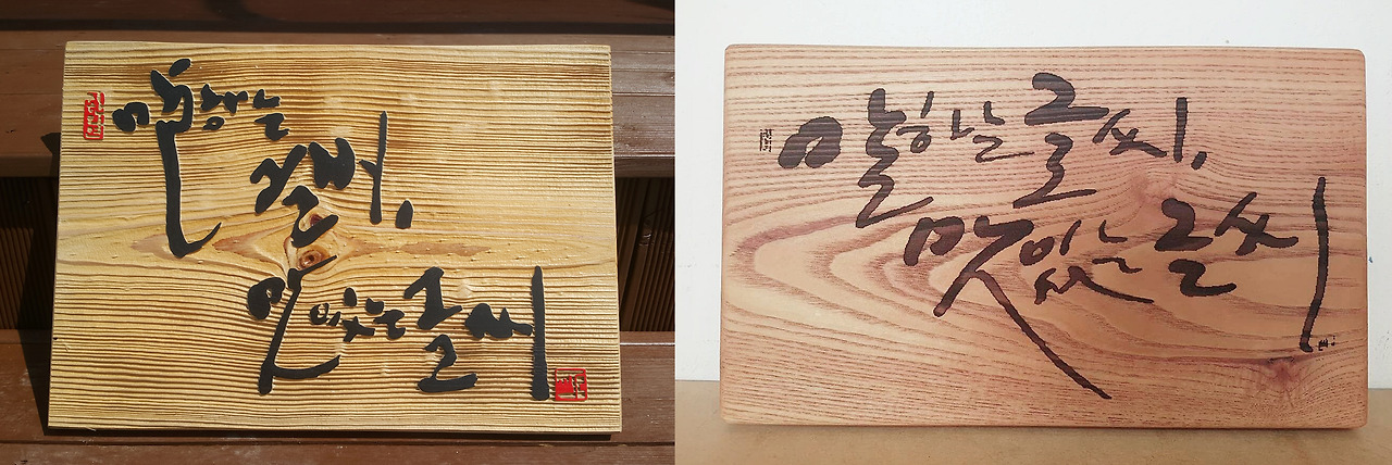 서두에 피력했던 부산의 ‘나무이야기’는 글자 하나하나를 나무 본드에 붙이는 수작업의 형태로 시간이 지나면 본드 약성이 다해 글자가 떨어지는 단점이 있었지만, 광주의 ‘어울 공방’과의 콜라보에서는 참죽나무 자체를 글자만 도안하기 때문에 나무가 썩지 않는 한 영구 보존이 가능하다.