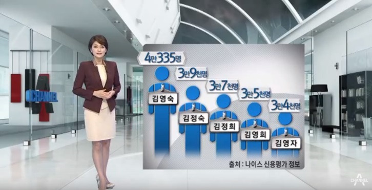 1년 전, 종합편성 채널A 뉴스에서 대한민국의 성씨와 이름 중 가장 흔하고 많은 사람들 대상으로 나이스 신용평가 정보에 의뢰해 조사가 이뤄졌다.