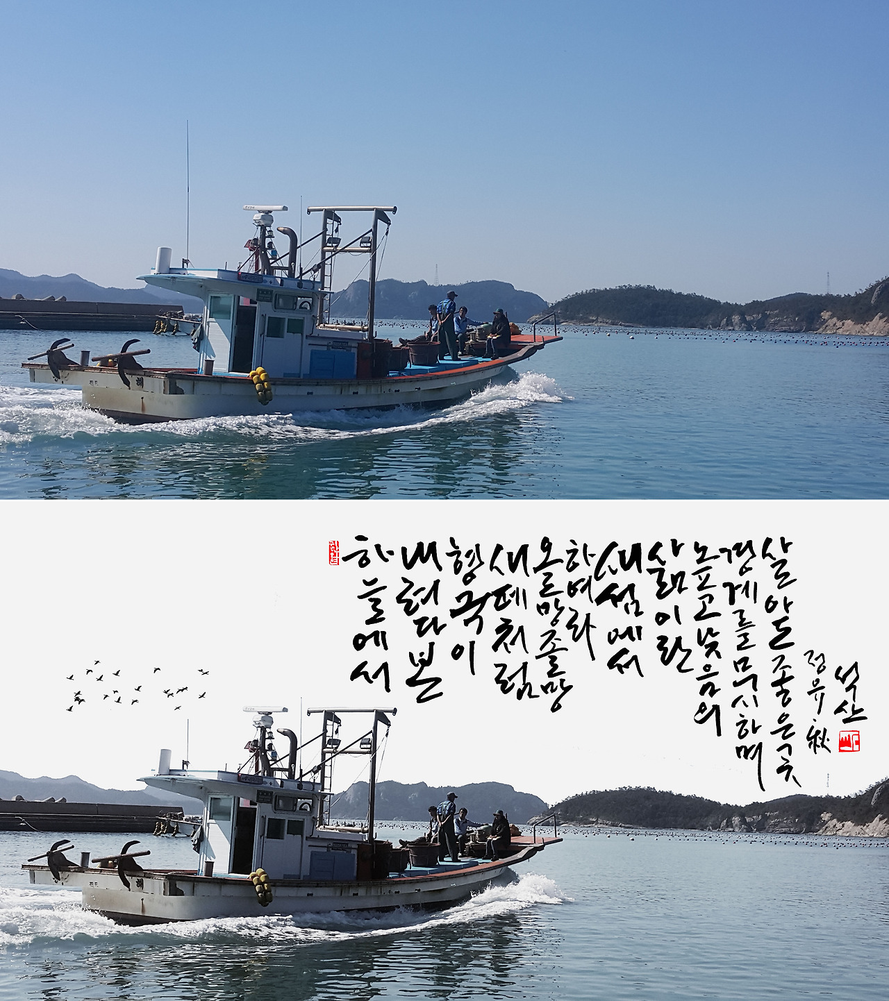 새섬(하늘에서 내려다본 형국이 새떼같이 보여 명명한 진도 조도면에 위치한 섬 중의 하나이다.)의 이야기를 지나가는 배 한 척, 새떼를 상징하는 새무리를 심어주었고, 캘리그래피가 들어가는 하늘에 흰 백으로 키를 따서 글씨를 살렸다. 여기서 하늘이 구름과 더불어 미적 형태를 뗬다면 다시 생각해 볼 문제였지만, 평범한 하늘 느낌이라 과감히 손을 댔다는 점이다.