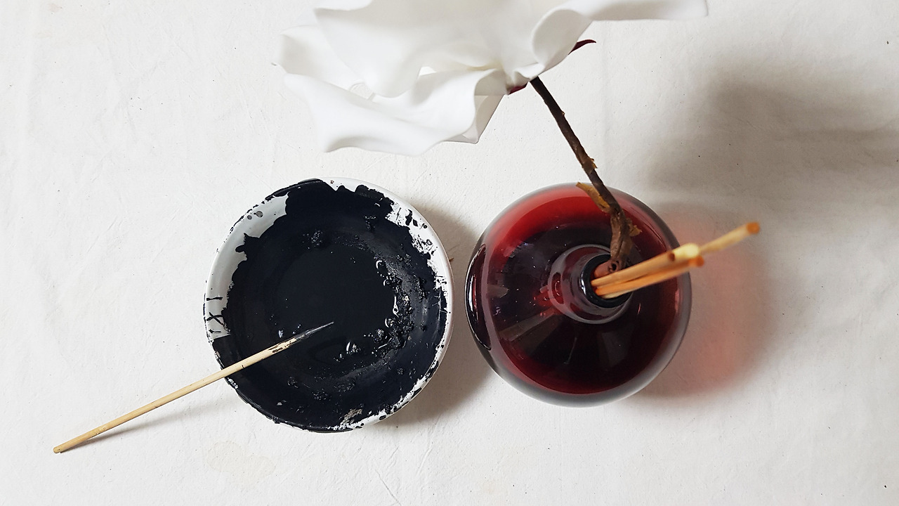 사진에 대한 서체 방향과 제목이 정해지면 붓을 든다. 이번 작업도 자연과 친밀도를 높이기 위해 일반 서예 붓을 배제하고 향수 화병에 꽃아 둔 나뭇가지를 이용해 글씨를 써 내려갔다.