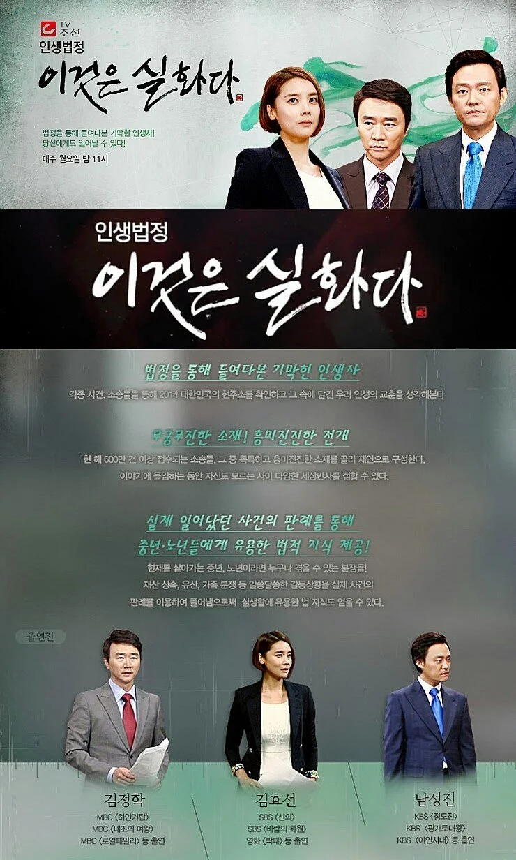 2014년 8월 18일 첫 방송되었던 TV조선 인생 법정 드라마 '이것은 실화다'의 출연진 시즌1에는 김정학, 김효선, 기연호, 정욱, 차광수, 김영석, 권민, 김선혁, 권문정, 김영인, 남성진, 최일화 씨가 맡았으며, 시즌2는 김철기, 박형준, 도용구, 서재경, 김경룡, 이민우에 이르기까지 2016년 10월 26일까지 총106부작을 마지막으로 방송이 종영되었다.