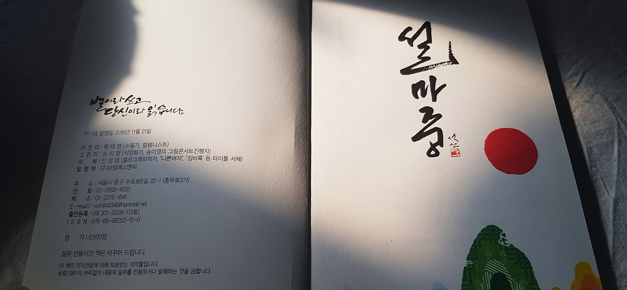 총 94페이지의 미니 북 레터를 책으로 펴내자며 책 속에 들어가는 캘리그래피 문장들을 검토해 달라고 했다. 책 메인타이틀은 “새날을 시작합니다”였으며, 부제로는 “별이라 쓰고 당신이라 읽습니다”였다. 지금 생각하면 故 황태영 선생은 감성적인 캘리그래피를 무척이나 사랑했었다.