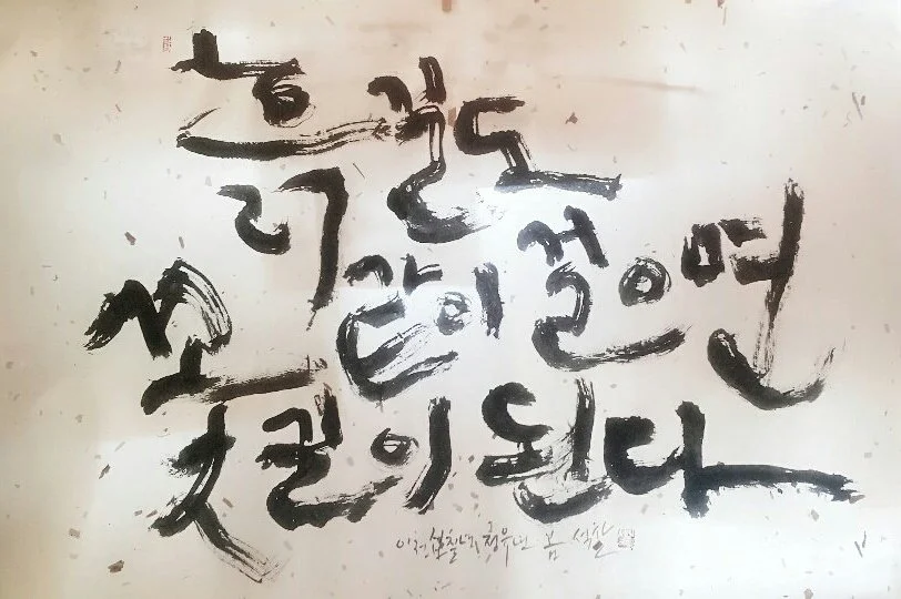 캘리그래피의 수많은 글꼴들이 이렇게 크고 작은 장단을 맞추면서 리듬을 탈 때 멋진 글씨로 탄생된다. 좀 삐뚤어진 글씨도 반듯하고 각진 인쇄 글씨 사이에 놓으면 아주 신선해 보인다.