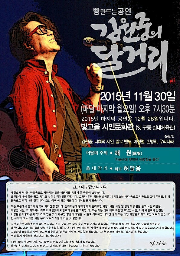 그러면서 공연 포스터에 들어갈 '김원중의 달거리'를 써줄 것을 부탁했다. “힘 있고 거칠 것 없는 글씨 느낌이었으면 좋겠다”는 말을 더 붙였다. 신념을 위해 노래를 부르는 김원중 씨에게 힘이 될 수 있는 글씨는 과연 어떤 것일까?를 고민에 고민을 하게 되었다.