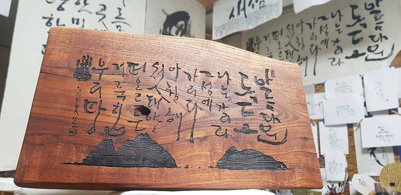 독도를 다녀온 후 ‘아름다운 독도’의 노랫말 일부를 대전지(大全紙)에 써 내려가기 시작했다. 그리고 오래도록 내가 작업하는 서실 벽에 걸려 있다.