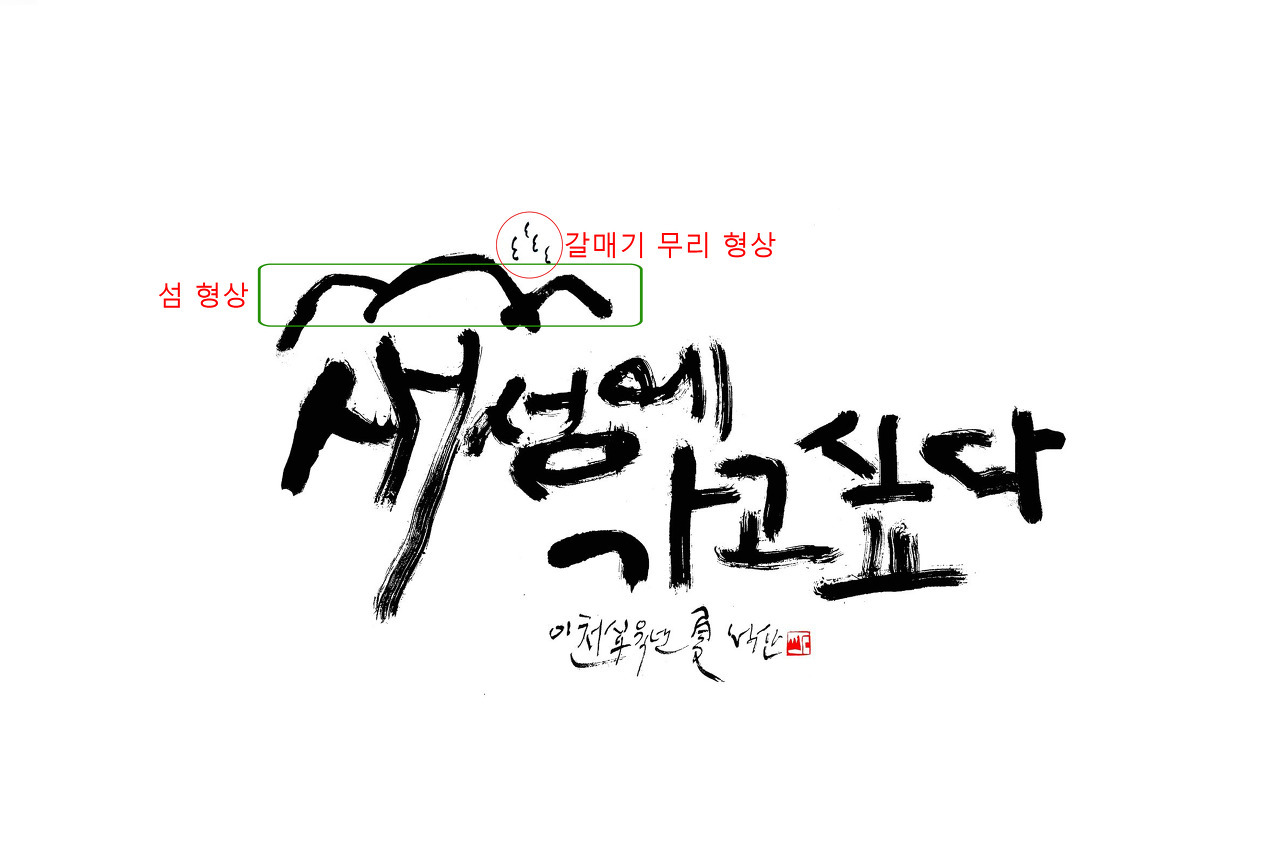 글씨 위에는 섬을 형상화한 산수갑산(山水甲山 : '삼수갑산'의 비표준어로 삼수갑산은 함경남도에 있는 삼수와 갑산 지방을 말한다. 의미로는 사람의 발길이 닿기 힘든 대단히 험한 오지 또는 몹시 어려운 지경이나 최악의 상황.)을 붓 터치로 가볍게 그려 놓고, 그 위에 물새들의 무리를 그려냈다. 단순하면서 함축적인 내용이어서 누구든지 쉽게 이해하고 공감을 하리라 본다.