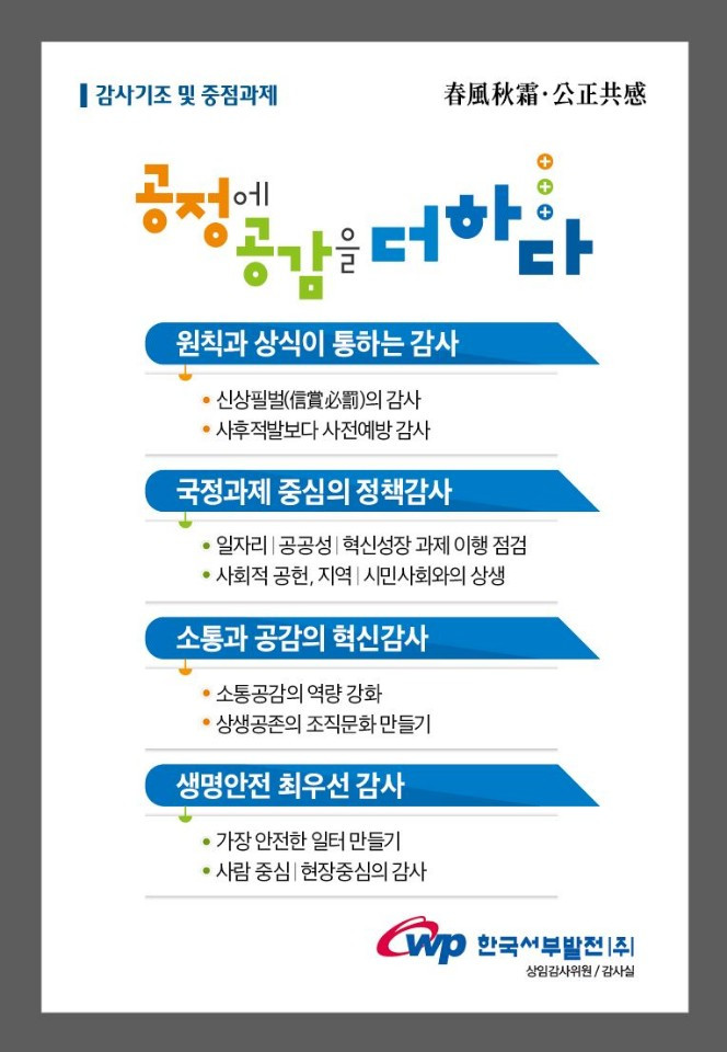 문재인 정부의 명(命)을 받아 한국서부발전(주) 상임감사위원으로 활동하고 있는 최향동 상임감사는 에너지 공공기관 최초로 '공정에 공감을 더하다'라는 감사기조를 확립하여 국민공기업으로써 '사회적 가치와 공공성 실현'에 앞장서는데 주력하고 있다.