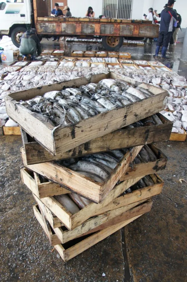나무 상자에 오징어가 가득 담겨 있다.