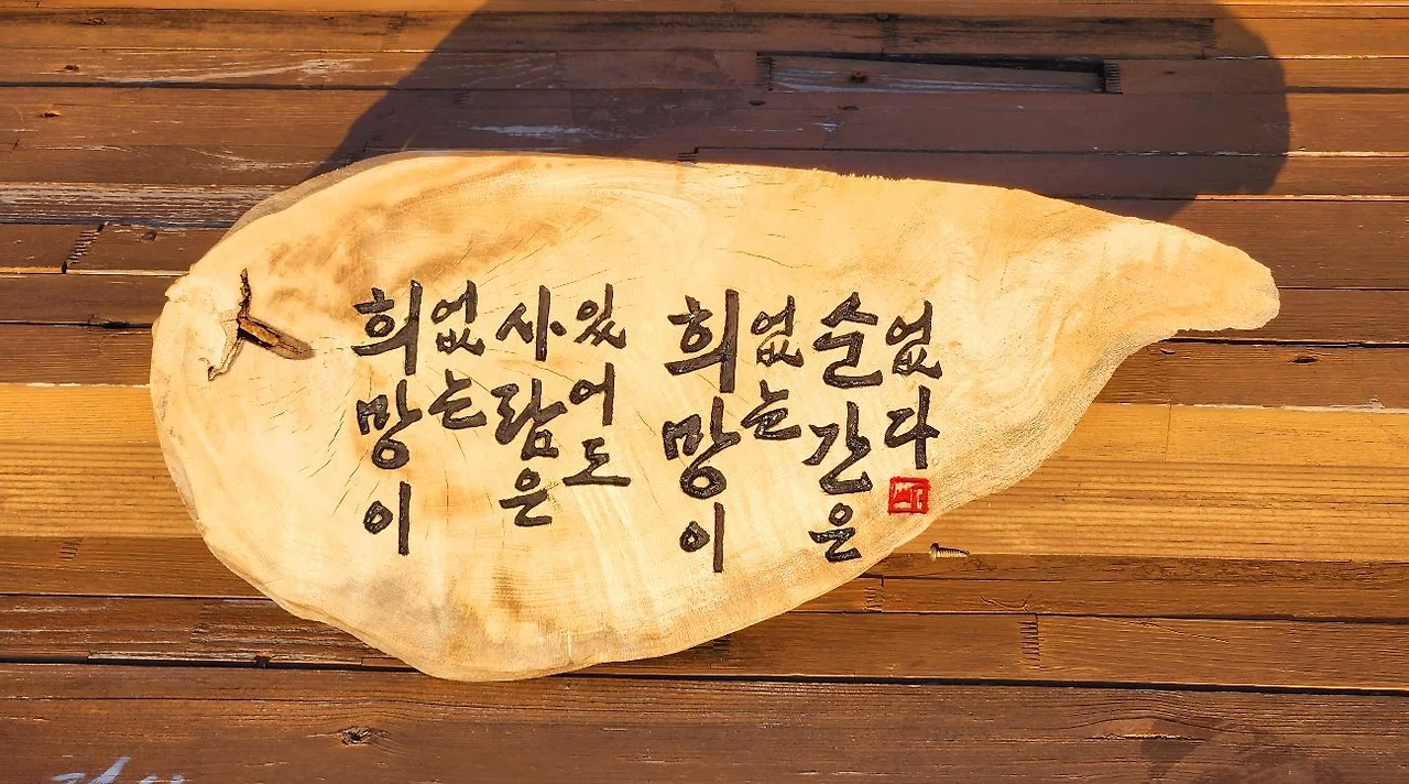 1. 팽나무는 서각 작업화 하는데 유용한 나무다. 우리나라 곳곳에 당산제를 올리는 신성시되는 팽나무는 더운 여름날 사람들에게 시원한 그늘막 역할을 하기도 한다. 물론, 강한 태풍의 비바람으로 고사되거나 수명을 다할 때는 서각쟁이들에게는 특별한 선물로 다가온다. 나무 결이 평평하고 튼튼한 팽나무는 글자를 새기기에는 더할 나이 없는 좋은 재료라는 점에서 귀한 나무임에 틀림없다.