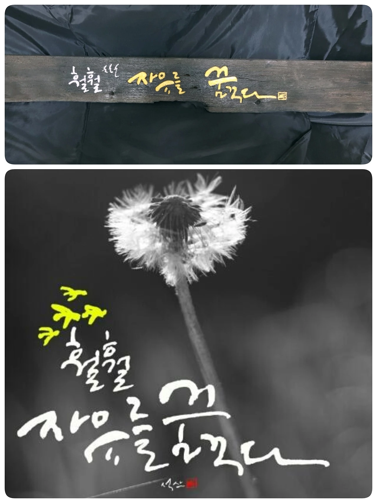 한때 자유를 꿈꾸며 썼던 캘리그래피는 봄날에 피어나 바람결에 흩어져 버린 하얀 민들레의 추억이다.