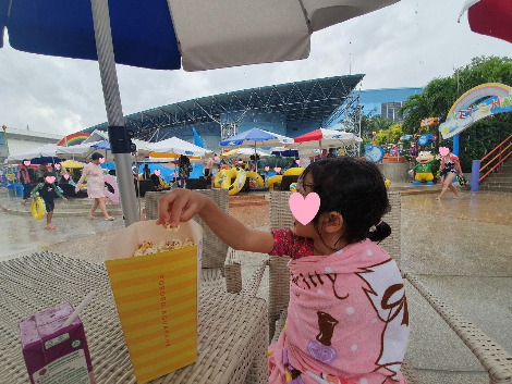 비록 태국어로 번역된 노래지만 익숙한 멜로디에 아이들은 뽀로로 노래를 흥얼거리며 기분 좋게 물놀이를 할 수 있습니다. 매표소에서 티켓을 구입하고 탈의실(입구 렌털 샵 맞은편 화장실과 함께 있음)에서 수영복으로 갈아입은 뒤 파라솔 밑 풀사이드 체어에 자리를 잡으면 준비는 끝입니다. 아이는 벌써 물놀이장으로 들어갔겠지요.