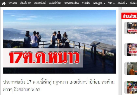 태국 매체 카오솟 온라인 홈페이지 캡처. (https://www.khaosod.co.th) 10월 17일부터 겨울이 시작됐다는 내용입니다.
