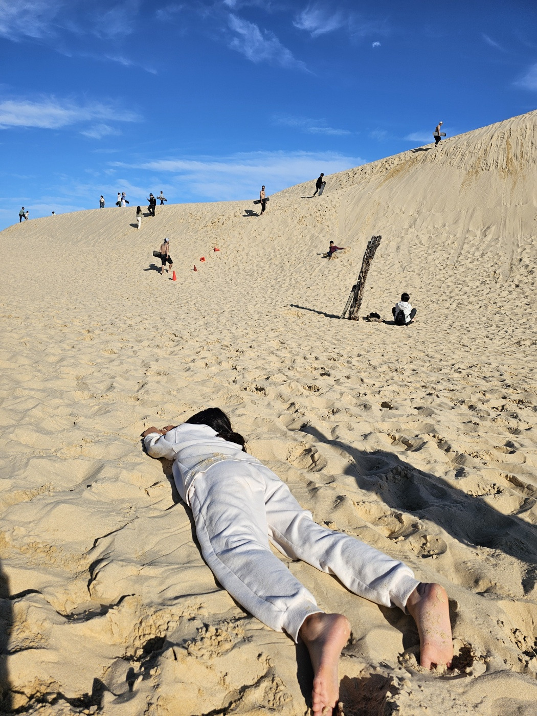 고래 관광을 마치고 점심을 먹은 뒤에 자유시간이 주어졌는데요. 경진이는 호주 바다에 들어가고 싶었어요. 그래서 팔다리를 걷어붙이고 바다로 들어갔죠. 바다가 깨끗하고 파도도 없고 신기했어요. 경진이는 신이 났고요. 다음은 사막 관광입니다. 바닷가에서 15분 정도 들어갔을까요? 사막 체험을 한다고 해서 사실 믿지 않았는데요. 제가 알기로 호주의 사막은 울룰루가 있는 내륙 황무지 지역에나 있다고 생각했거든요. 그런데 사막체험하는 곳에 도착해 보니 정말로 사막이더라고요. 끝도 없이 펼쳐진 모래밭이요. 우리나라에는 충남 태안에 신두리 해안사구가 있는데요. 여기가 바로 그런 해안사구였어요. 바다 모래가 날아와서 끝없이 쌓인 곳이죠. 호주는 뭐든지 큰가 봅니다. 높다란 모래 절벽으로 올라가서 보드를 타고 내려옵니다. 샌드보딩인데요. 경진이는 낭떠러지에서도 전혀 망설임 없이 출발하더라고요. 대단한 꼬맹입니다. 화성에 온 것 같은 비현실적인 광경 속에서 신나게 놀고, 화성 탐험차 같은 해괴하게 생긴 차를 타고 철수합니다.