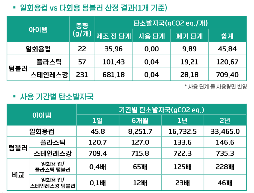 - 네 저도 텀블러를 사용한 지 꽤 됐는데요. 사실은 이렇습니다. 텀블러와 1회용컵 한 개를 하루 동안 사용했을 때의 탄소량을 비교한 겁니다. 그런데 텀블러는 한 번만 쓰는 게 아니잖아요. 일회용컵을 하루에 하나씩 쓰고, 텀블러는 하루에 한 번 세척해서 사용한다고 가정하고 사용기간에 따라 탄소배출량을 비교해 보면 실제상황과 비슷해지는데요. 6개월이 지나면 일회용컵 사용이 텀블러보다 12배 탄소를 더 많이 배출하고 1년이 지나면 23배, 2년이 지나면 46배 더 많이 탄소를 배출하게 됩니다. 그러니까 여기저기서 선물 받은 텀블러가 수납장에서 쌓여가고 있다면 오히려 환경에 악영향을 끼치는 것이죠. 텀블러를 오래 사용하면 할수록 플라스틱 일회용컵보다 탄소배출량을 확실히 줄일 수 있습니다.