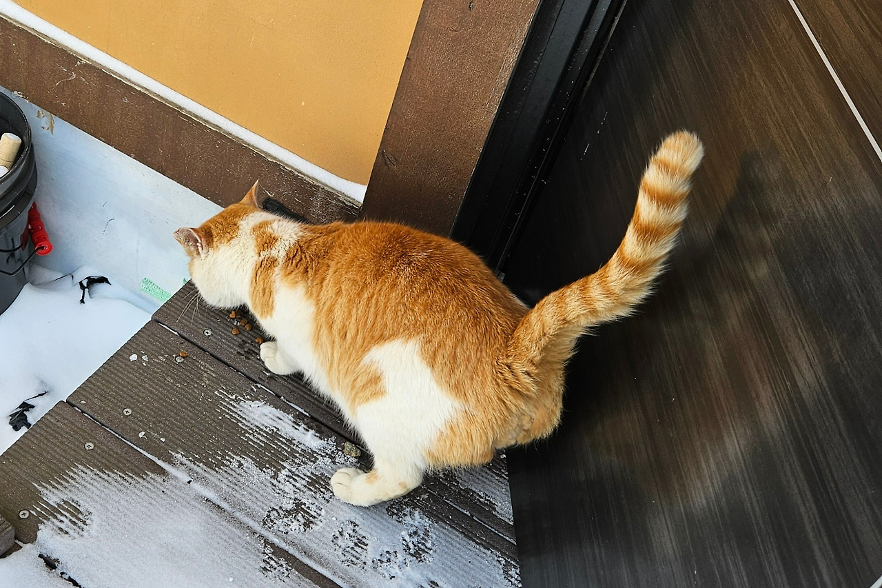 전국에 강추위가 찾아온 2025년 2월. 설피마을에도 강추위가 찾아왔죠. 생태유학 어린이들이 제각각 도시로 떠난 뒤 설피마을에 남겨진 길개냥이 치치는 어떻게 지내는지, 혹시 너무 추워서 변을 당하지 않았는지 걱정이 되기도 했습니다. 그러나 많은 사람들의 관심과 사랑으로 치치는 혹독한 겨울을 무사히 넘길 수 있을 것 같습니다. 생태유학 진동리 담당자 양 주임님이 오며 가며 치치를 챙겨주셨고요. 진동분교로 입학해 2년을 설피마을에서 보낸 쌍둥이네가 조금씩 짐을 빼면서 천천히 이사를 하는 동안 치치를 돌봐줬습니다.
